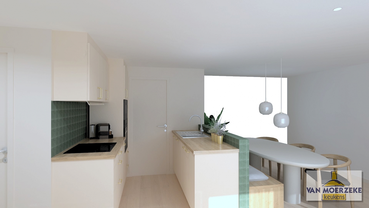 De keukenfronten zijn uitgevoerd in melamine met een anti-fingerprint matlak toplaag in de kleur crema magnolia. Deze afwerking voegt niet alleen een zachte en warme uitstraling toe, maar voorkomt ook zichtbare vingerafdrukken, wat bijdraagt aan een onderhoudsvriendelijke keuken. De lichte tint van crema magnolia brengt een subtiele elegantie in de ruimte, terwijl het materiaal duurzaam en betaalbaar blijft.