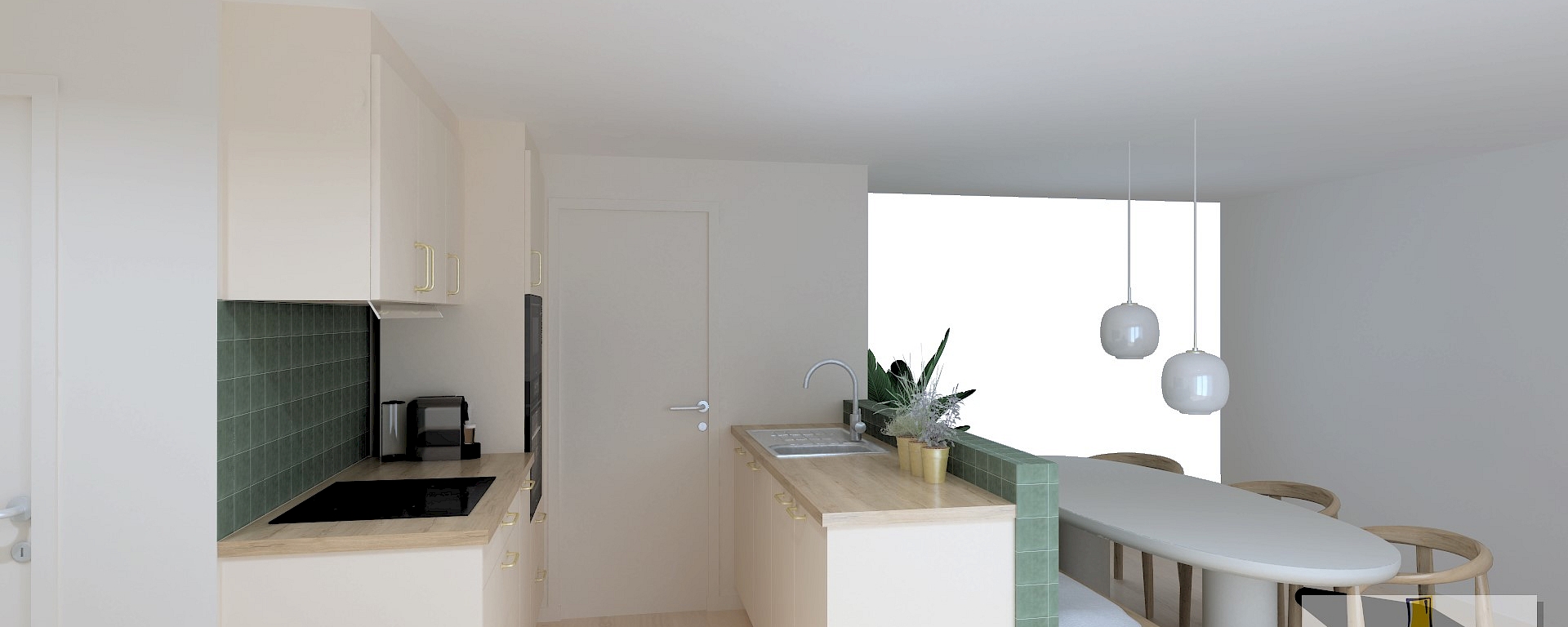 Dit keukenontwerp biedt een harmonieuze combinatie van stijl en functionaliteit binnen een beperkt budget. De zacht tint van keukenfronten en warme houtlook van het werkblad creëren een elegant geheel. Met de Pelgrim-toestellen die voorzien zijn van een extra lange garantieperiode en een slimme, compacte indeling, is deze keuken perfect voor starters die op zoek zijn naar betaalbare luxe zonder compromissen.