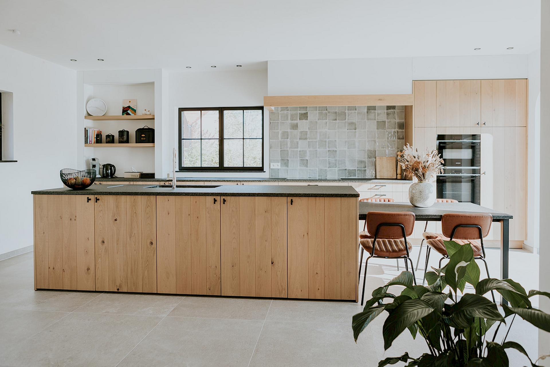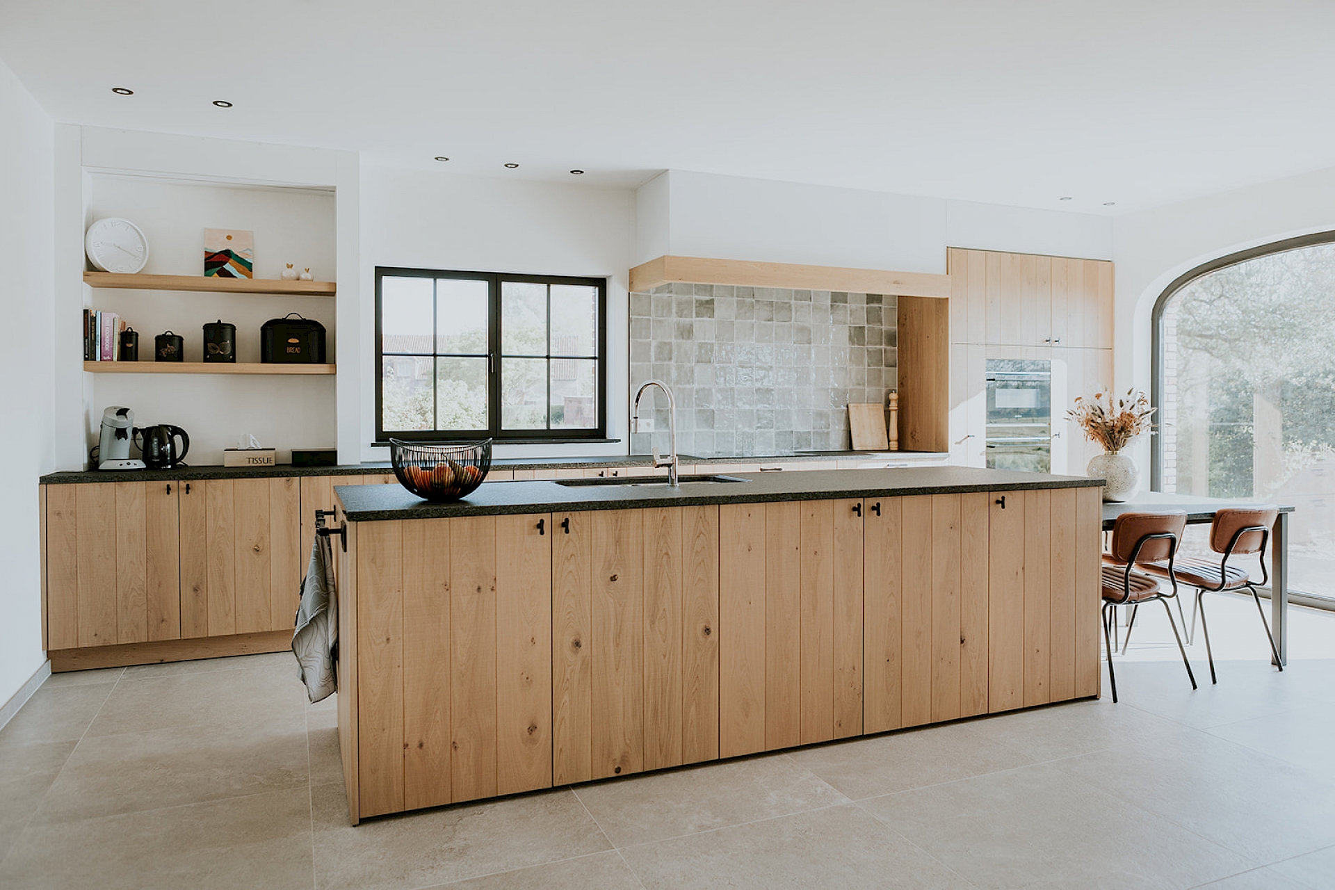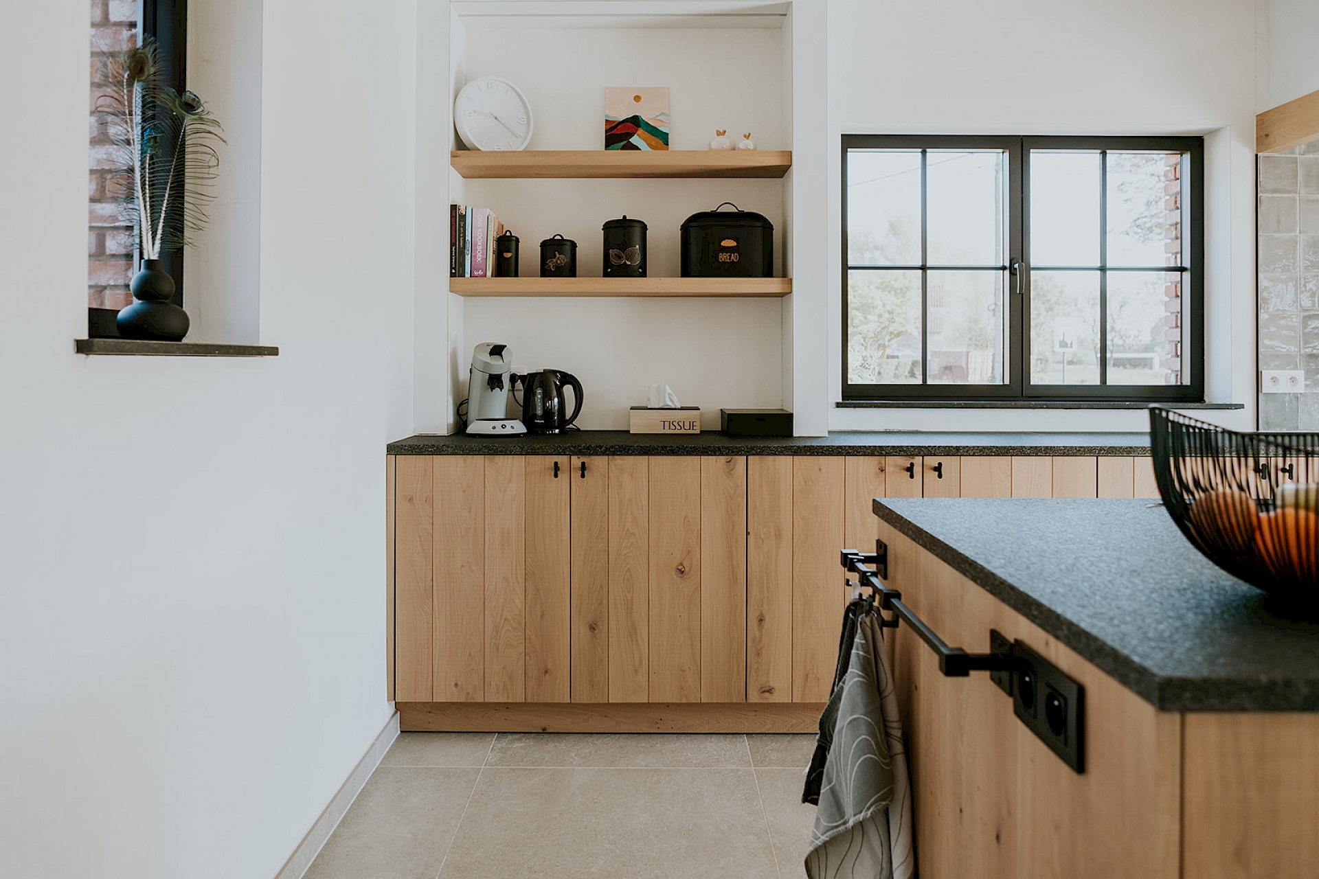 De fronten zijn uitgevoerd in model Semio, half massief eik met wisselende U-groeven. Het gekozen rustieke eikenhout toont zijn natuurlijke charme met karaktervolle noesten, terwijl de scratch- en zaagruwe bewerking zorgt voor een stoere, authentieke toets. Het robuuste granieten werkblad in Bedrock Black met riverwashed oppervlak vult dit prachtig aan en straalt pure degelijkheid uit. De zwarte greepjes in verouderd ijzer geven de keuken een landelijke elegantie, aangevuld met een bijpassende handdoekenstang in hetzelfde materiaal. Achter de charme schuilt ook slimme functionaliteit: een volledig uittrekbare apotheekkast zorgt voor een overzichtelijke en praktische opslag van de keukenvoorraad. Daarnaast is er een apart koffiehoekje ingericht, een gezellige plek op het werkblad waar ruimte is om persoonlijke spullen te etaleren.