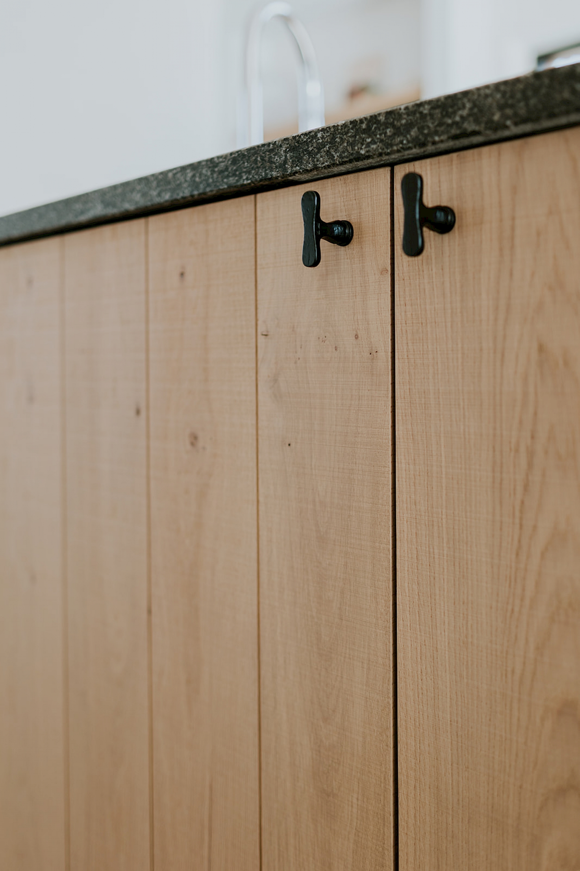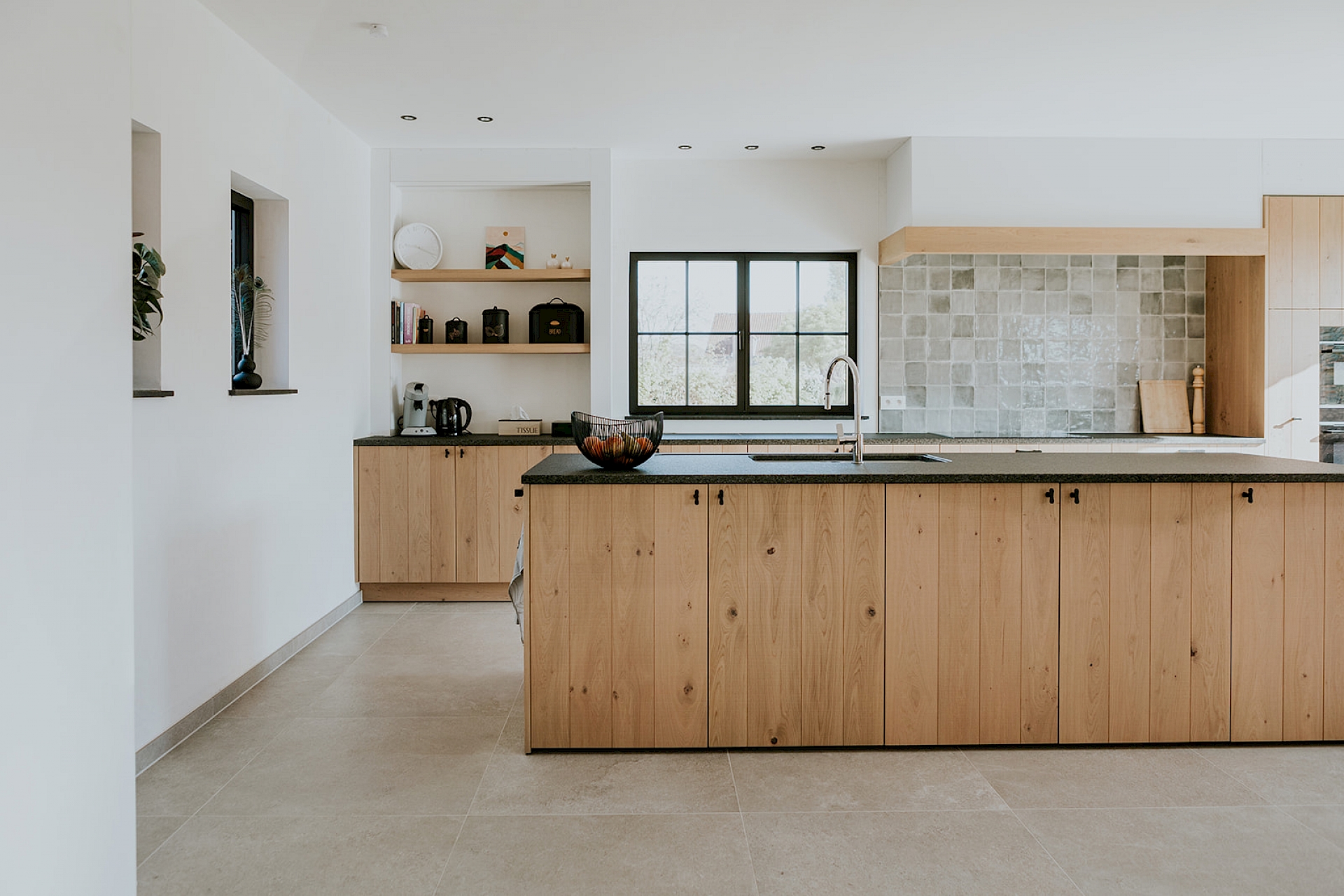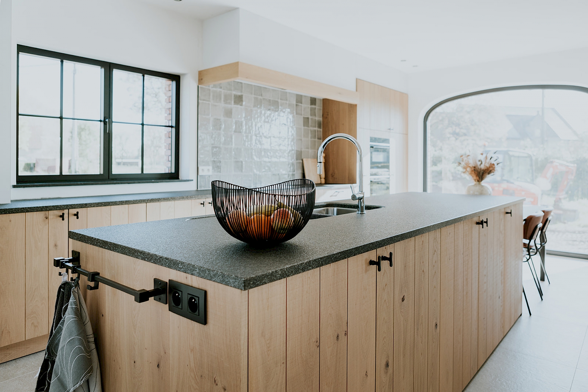 De fronten zijn uitgevoerd in model Semio, half massief eik met wisselende U-groeven. Het gekozen rustieke eikenhout toont zijn natuurlijke charme met karaktervolle noesten, terwijl de scratch- en zaagruwe bewerking zorgt voor een stoere, authentieke toets. Het robuuste granieten werkblad in Bedrock Black met riverwashed oppervlak vult dit prachtig aan en straalt pure degelijkheid uit. De zwarte greepjes in verouderd ijzer geven de keuken een landelijke elegantie, aangevuld met een bijpassende handdoekenstang in hetzelfde materiaal. Achter de charme schuilt ook slimme functionaliteit: een volledig uittrekbare apotheekkast zorgt voor een overzichtelijke en praktische opslag van de keukenvoorraad. Daarnaast is er een apart koffiehoekje ingericht, een gezellige plek op het werkblad waar ruimte is om persoonlijke spullen te etaleren.