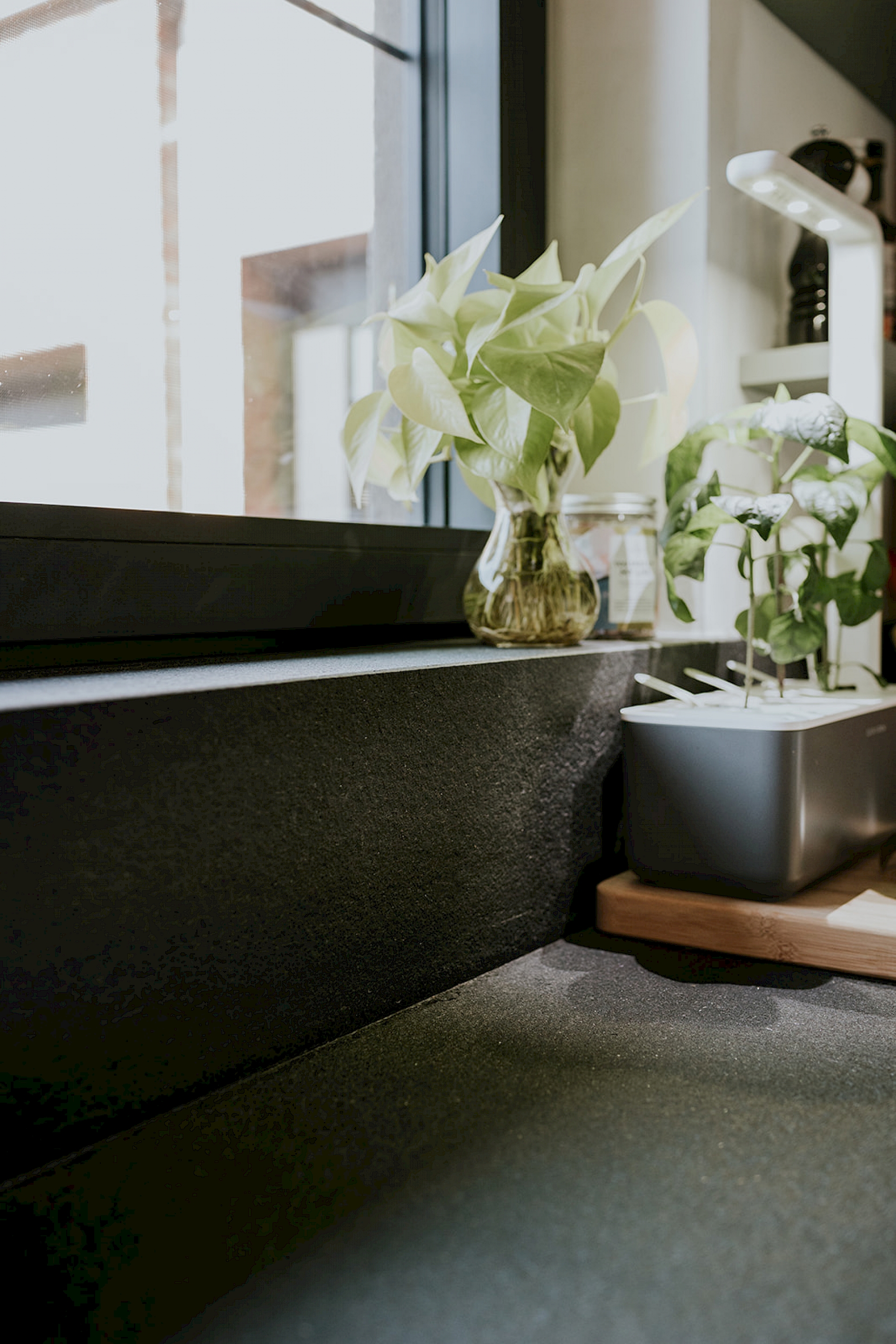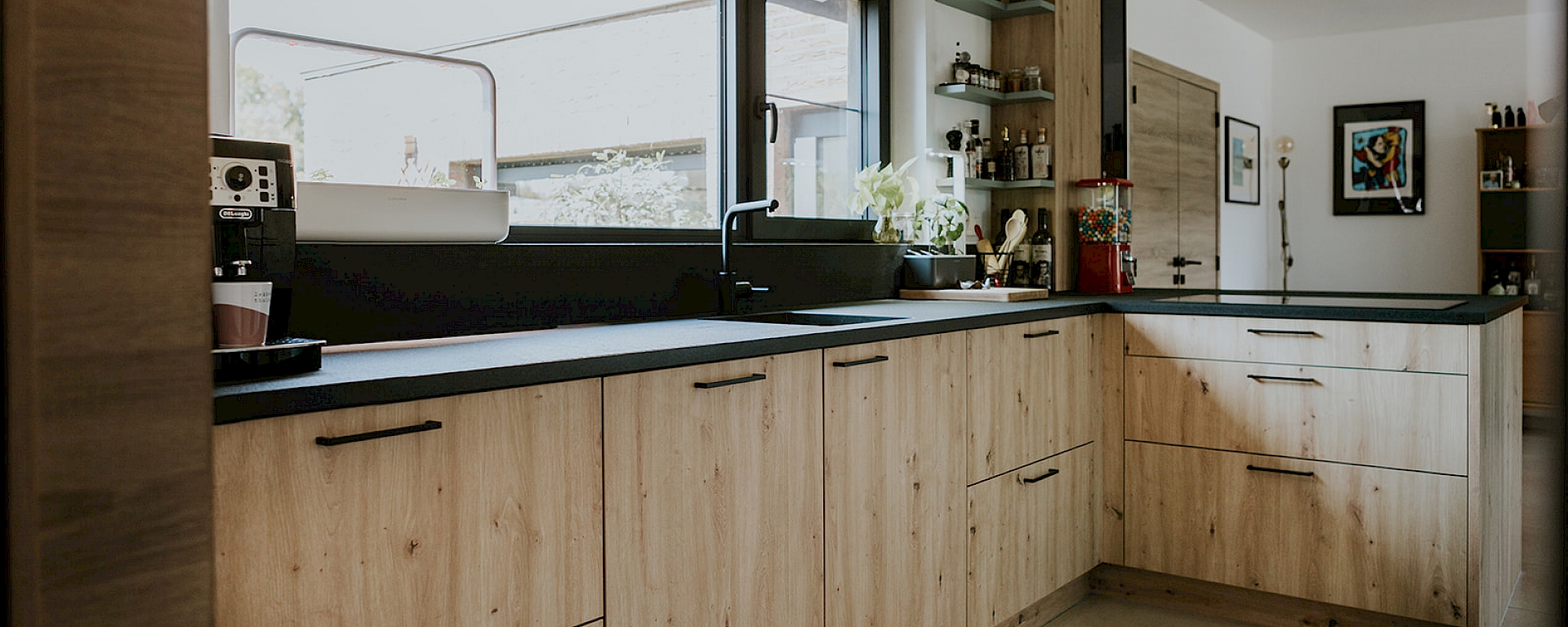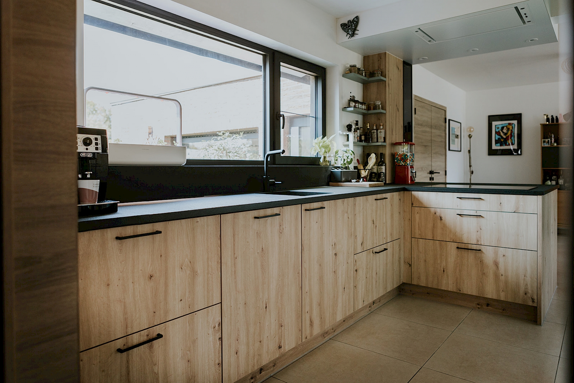 Een keuken is veel meer dan een plek om te koken. Het is een ruimte waar je samenkomt, herinneringen maakt en waar jouw persoonlijkheid zichtbaar mag zijn. Dit ontwerp bewijst hoe materialen en accenten samen een sfeervolle en unieke plek vormen. De basis bestaat uit BALI zomereik fronten met een granieten werkblad in Black I riverwashed. De warme houtlook en het karaktervolle graniet – ook doorgetrokken in de vensterbank – zorgen voor een tijdloze, gezellige uitstraling.