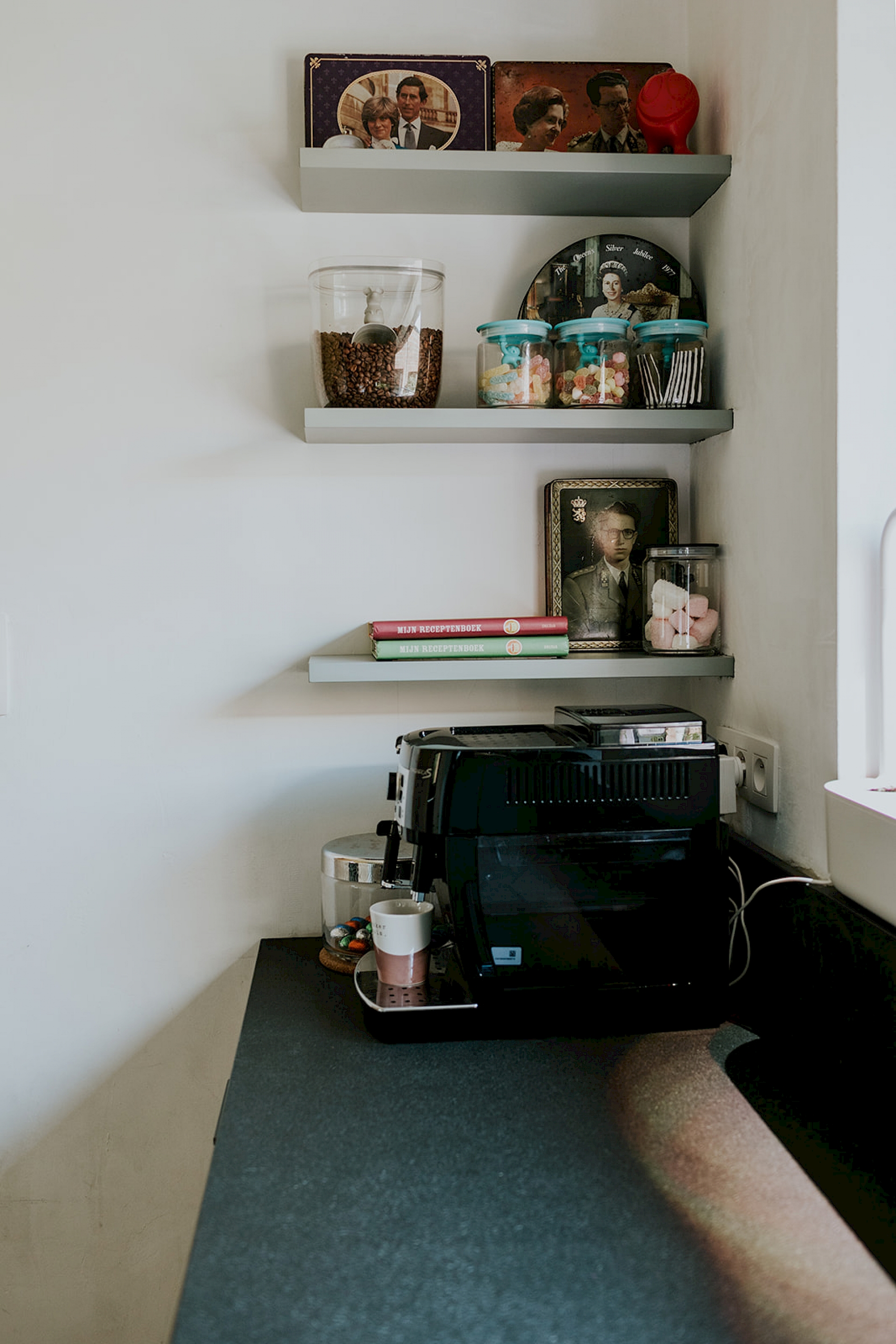 Wat deze keuken echt bijzonder maakt, zijn de persoonlijke details. Een op maat gemaakte vitrinekast laat de bijzondere uraniumglascollectie van de bewoners schitteren, dankzij een subtiele UV-ledstrip. Eucalyptusgroene wandregalen brengen extra speelsheid en geven ruimte aan persoonlijke snuisterijen.