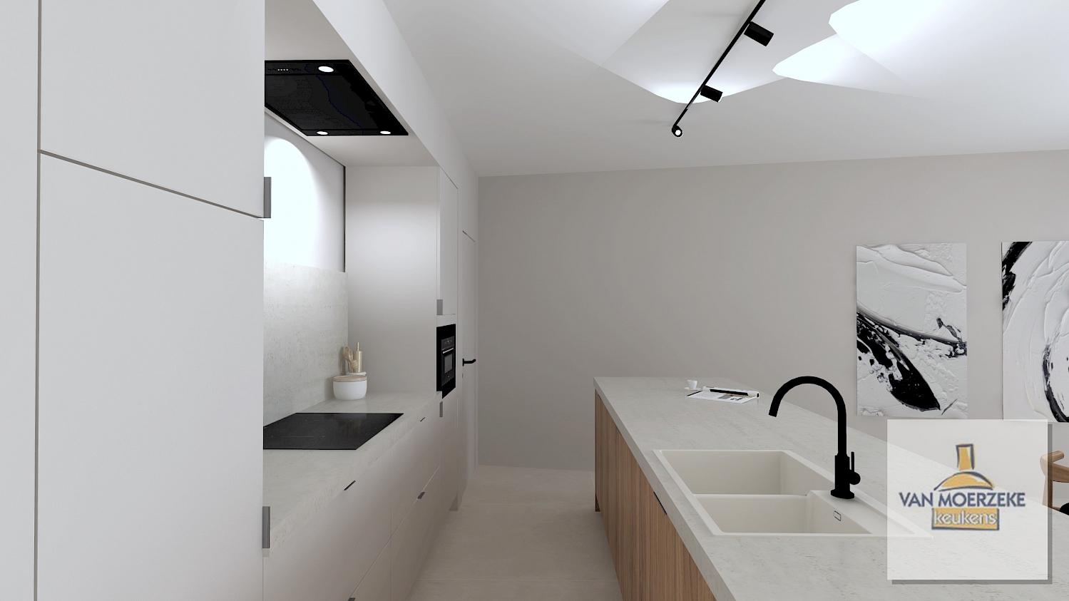 Voor de afzuiging is gekozen voor een strakke inbouwdampkap in plafondunit, uitgevoerd in zwart. Deze moderne oplossing zorgt voor een efficiënte afvoer van kookdampen zonder het strakke design van de keuken te verstoren.