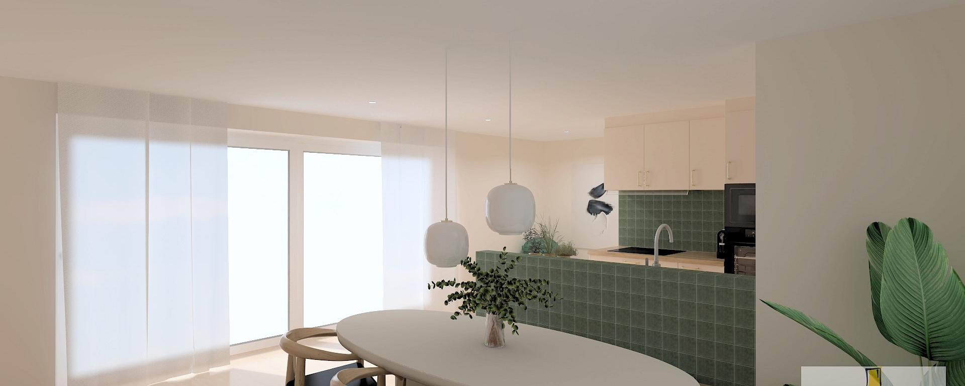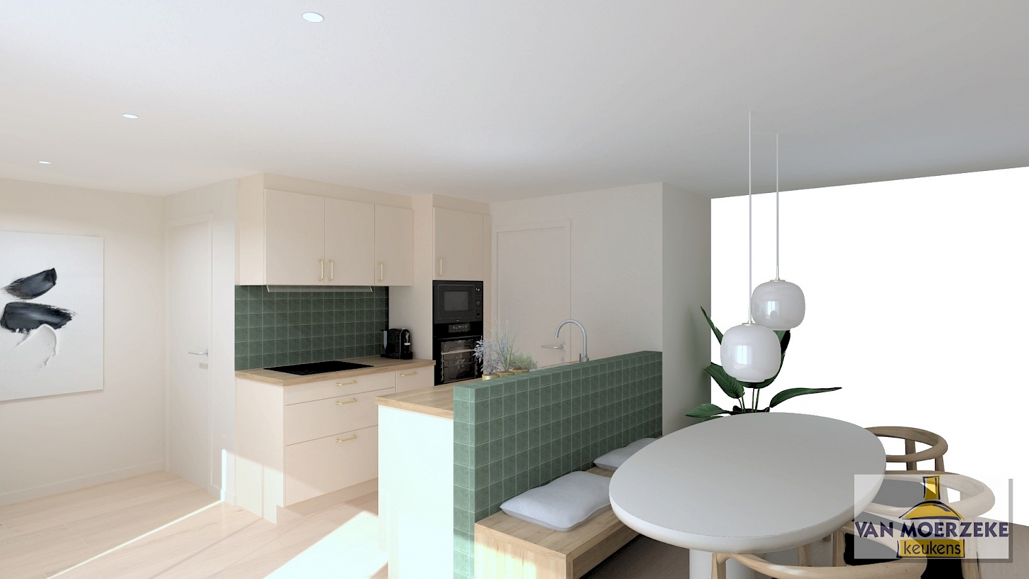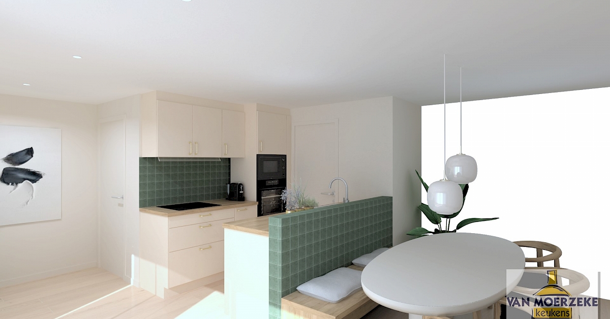 Dit keukenontwerp biedt een harmonieuze combinatie van stijl en functionaliteit binnen een beperkt budget. De zacht tint van keukenfronten en warme houtlook van het werkblad creëren een elegant geheel. Met de Pelgrim-toestellen die voorzien zijn van een extra lange garantieperiode en een slimme, compacte indeling, is deze keuken perfect voor starters die op zoek zijn naar betaalbare luxe zonder compromissen.