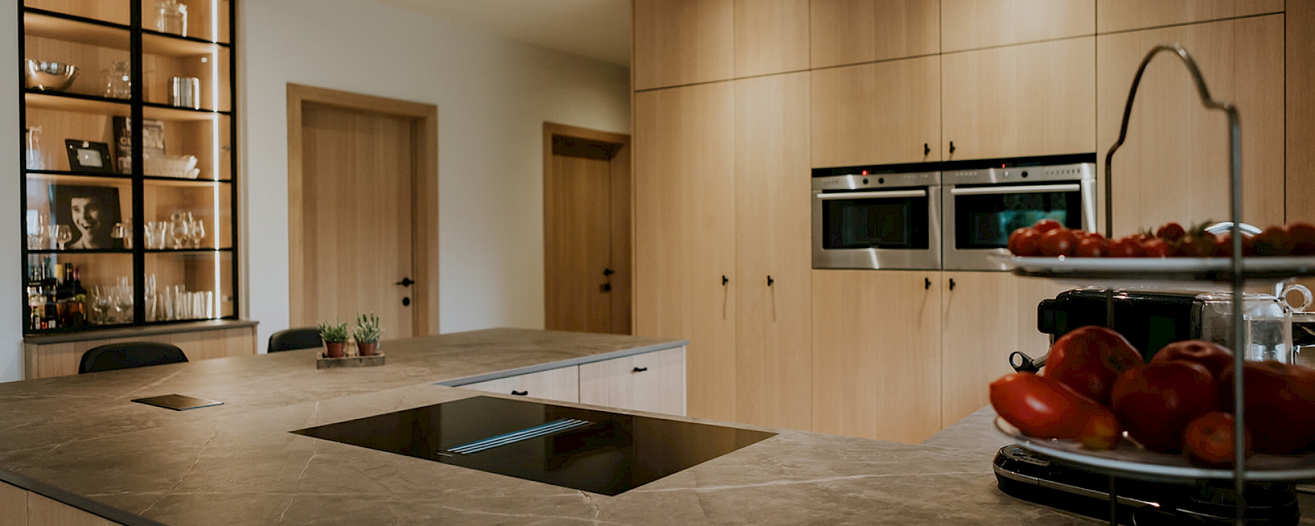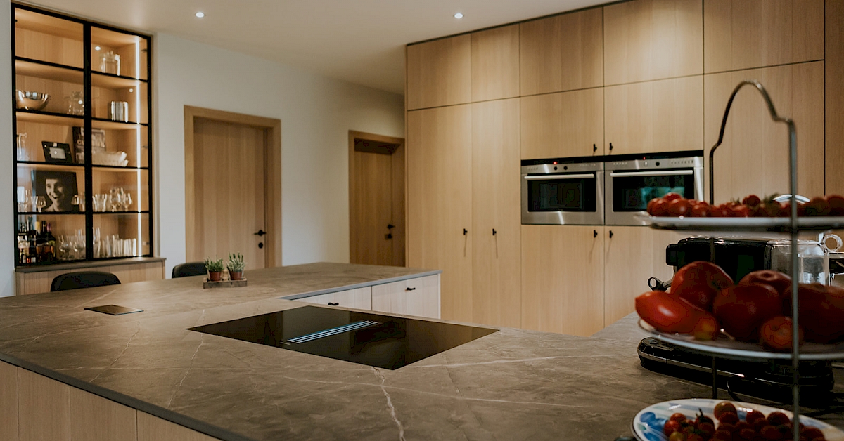 Centraal in deze keuken is een geavanceerde kookplaat met kookveldafzuiging van Miele voorzien. Deze innovatieve afzuiging zorgt niet alleen voor een efficiënte verwijdering van kookdampen en geuren, maar geeft ook enigzins extra vrijheid bij het ontwerpen van de keukenopstelling. De keuken is niet alleen esthetisch warm strak, maar ook praktisch met veel opbergruimte ontworpen. Kasten en lades bieden voldoende ruimte voor het opbergen van keukengerei, potten, pannen en voorraad. Bovendien is er zitgelegenheid geïntegreerd, waardoor de keuken een gezellige ontmoetingsplaats wordt waar familie en vrienden kunnen samenkomen terwijl er wordt gekookt.