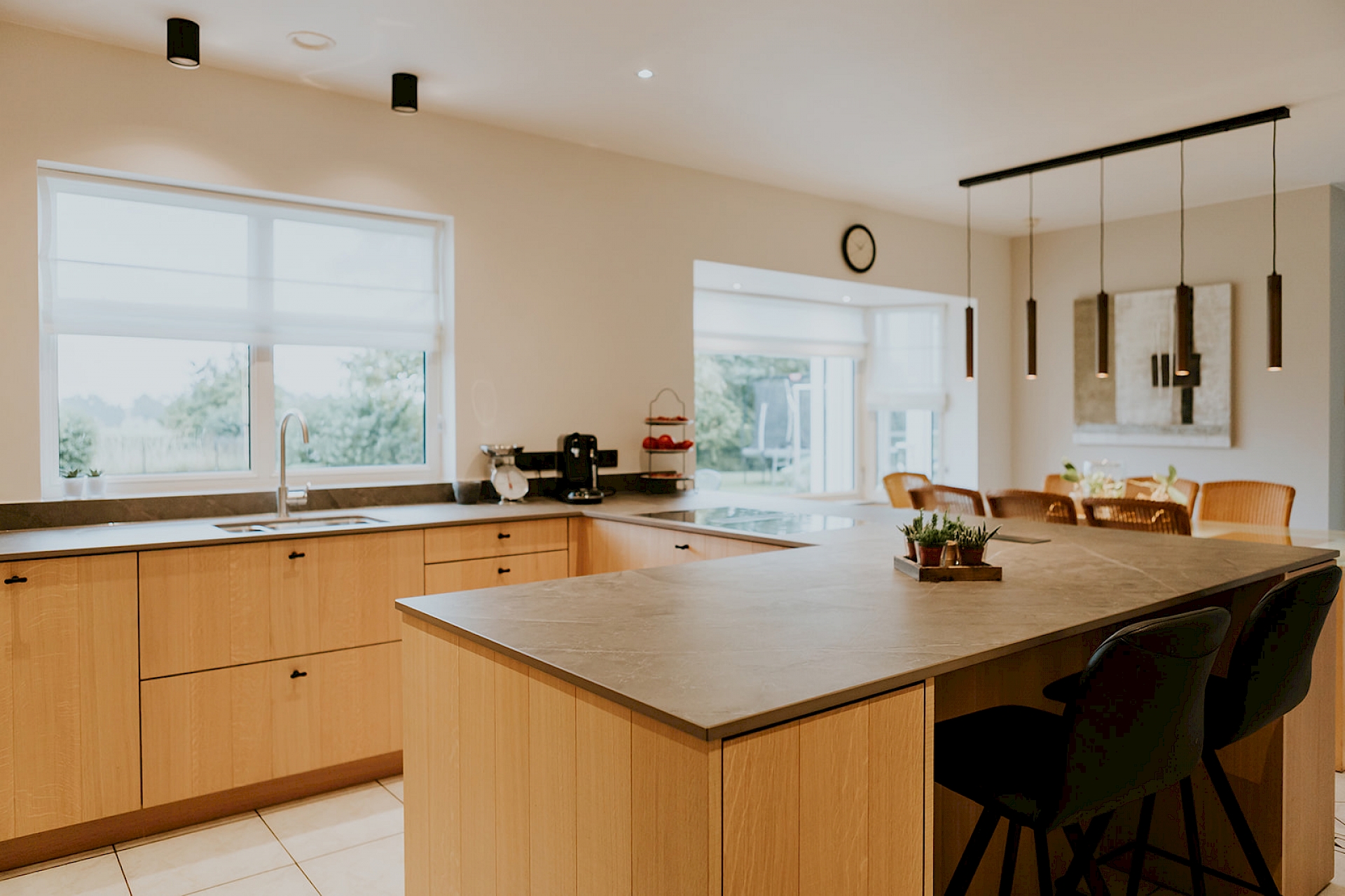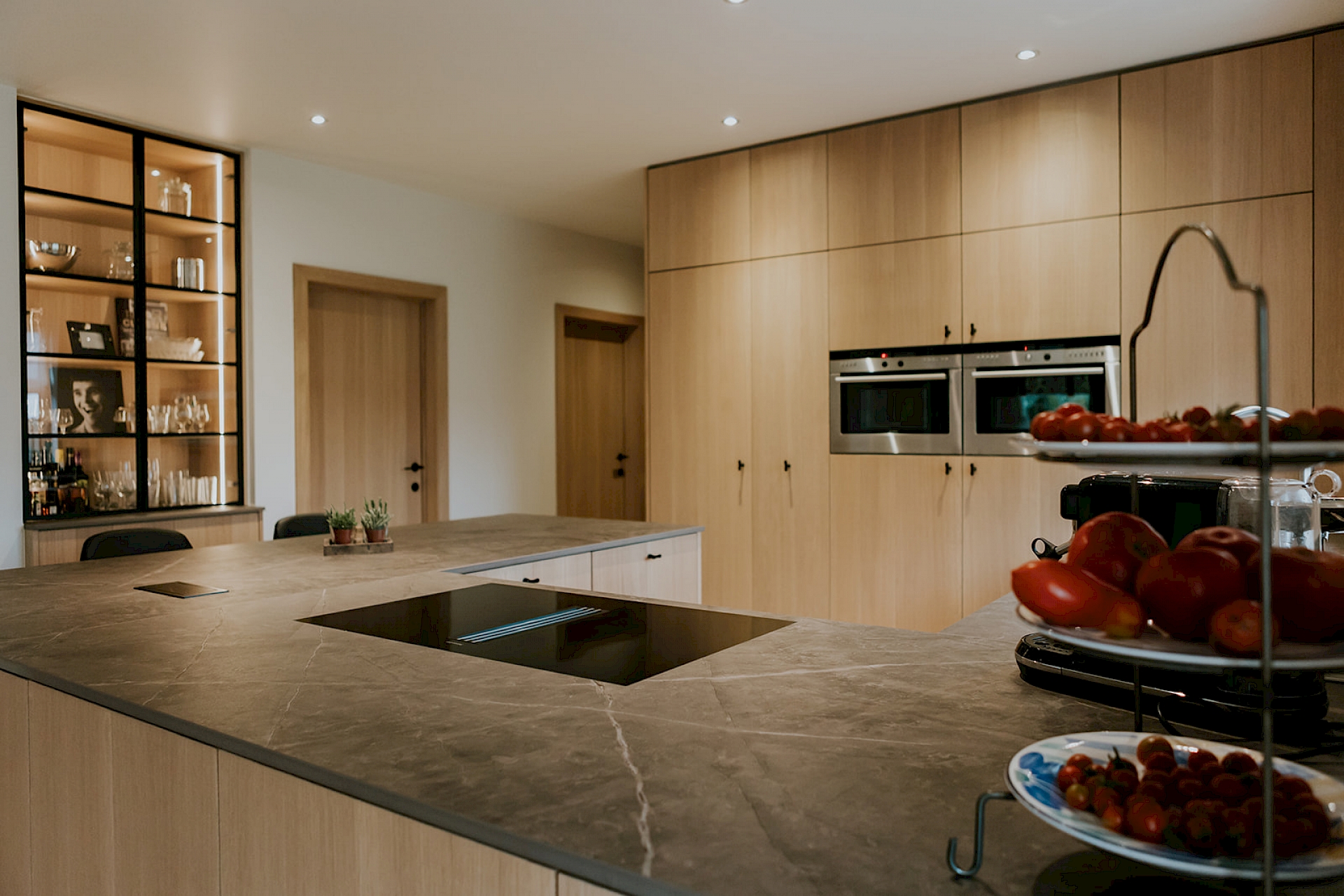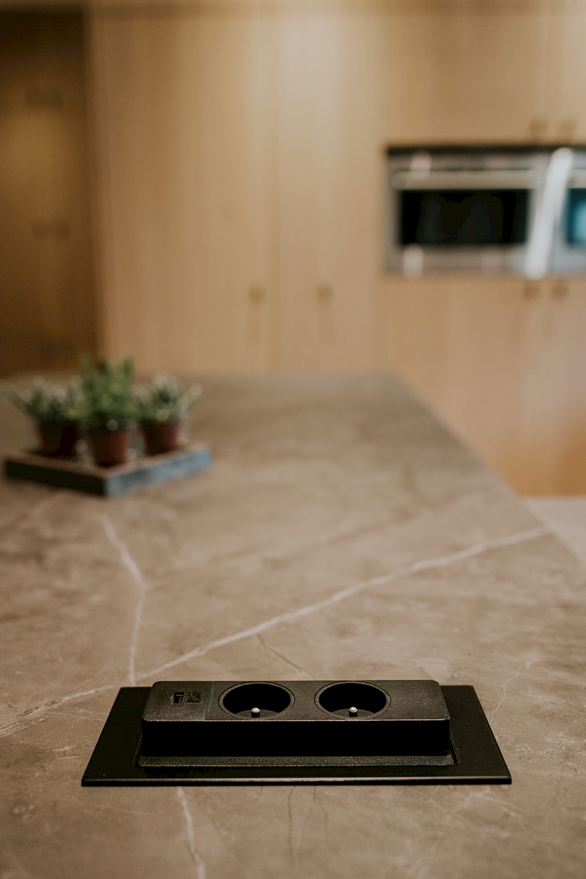 In het Dekton werkblad in een backflip stopcontactmodule voorzien die extra gebruiksgemak biedt door elektrische aansluitingen binnen handbereik te hebben wanneer dat nodig is. Na gebruik kan dit discreet worden ingeklapt om een strakke uitstraling te behouden. Het resultaat is een keuken die zowel functioneel als uitnodigend is, met een harmonieuze combinatie van materialen en functionaliteit.
