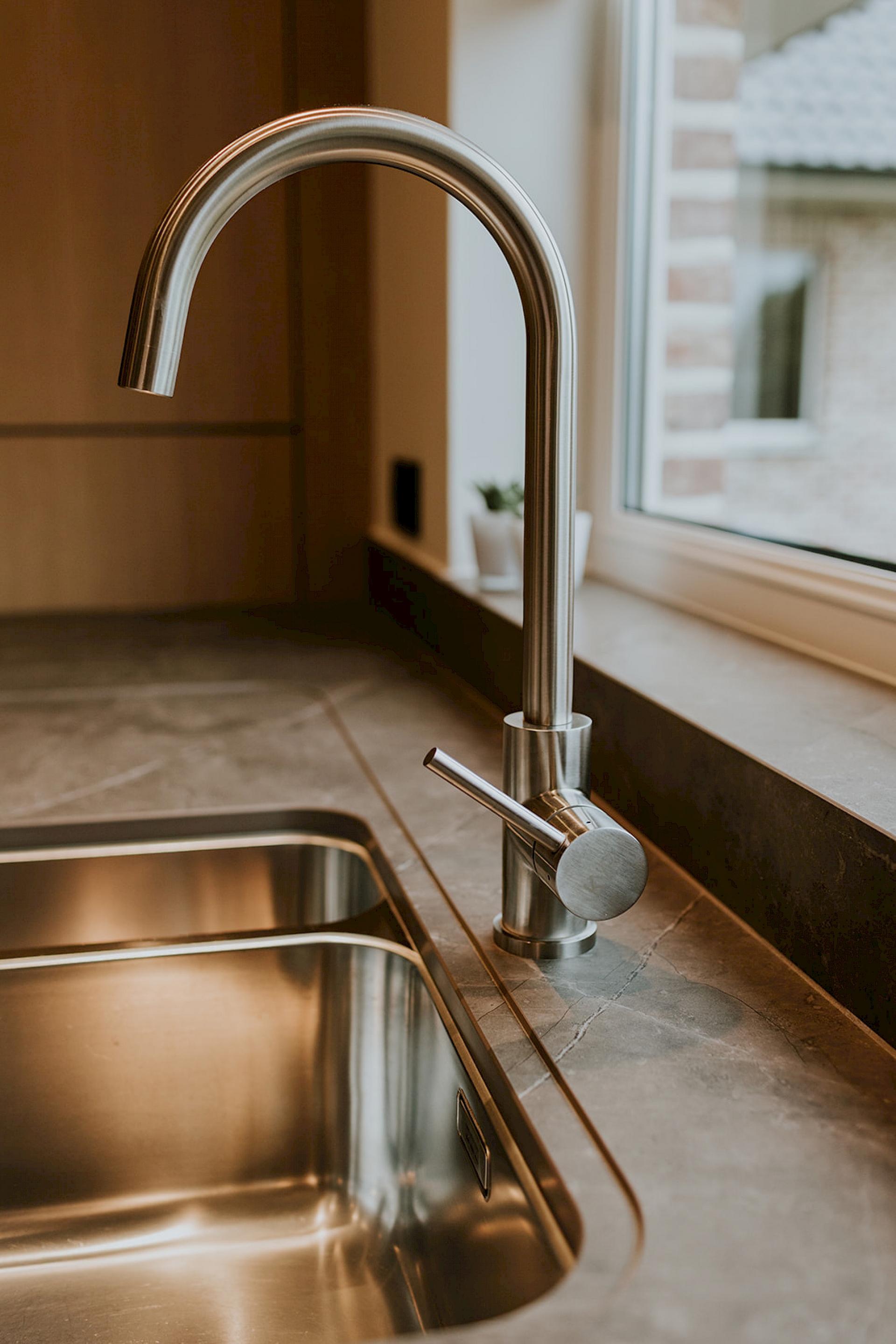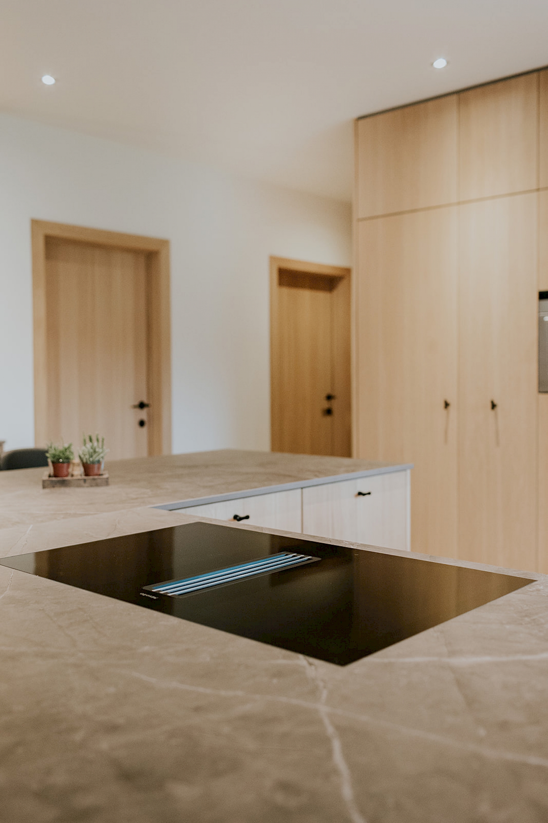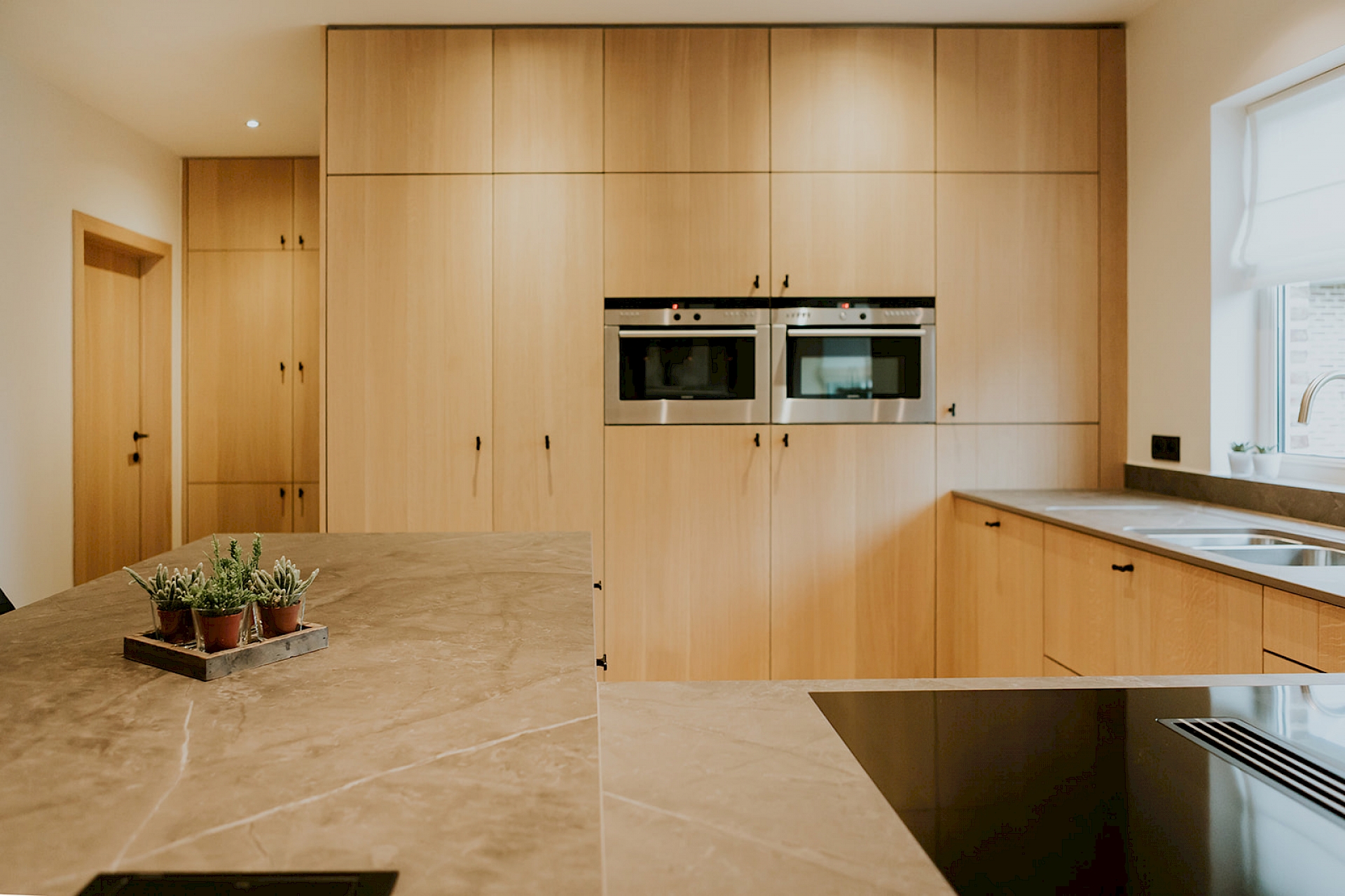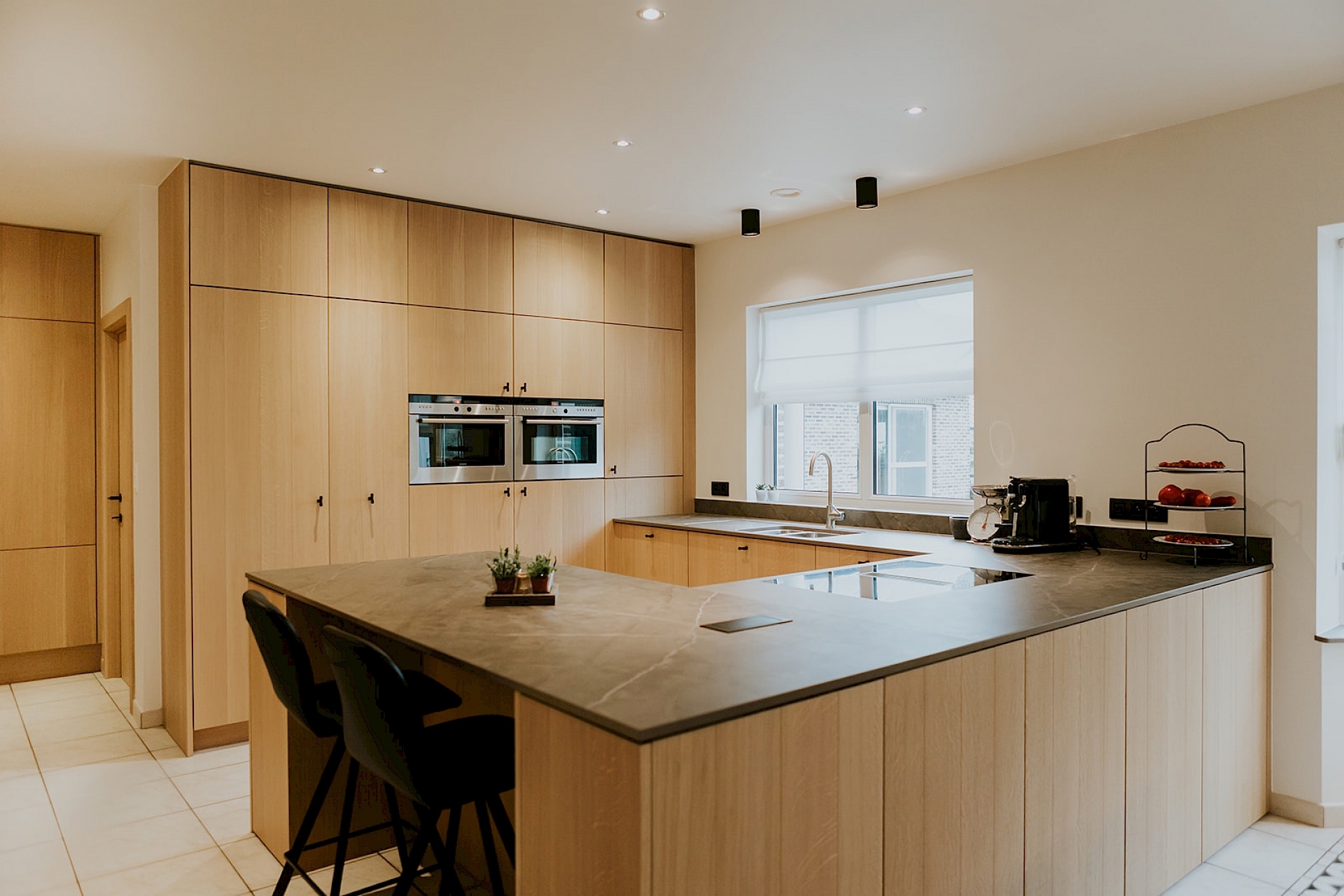 In het Dekton werkblad in een backflip stopcontactmodule voorzien die extra gebruiksgemak biedt door elektrische aansluitingen binnen handbereik te hebben wanneer dat nodig is. Na gebruik kan dit discreet worden ingeklapt om een strakke uitstraling te behouden. Het resultaat is een keuken die zowel functioneel als uitnodigend is, met een harmonieuze combinatie van materialen en functionaliteit.