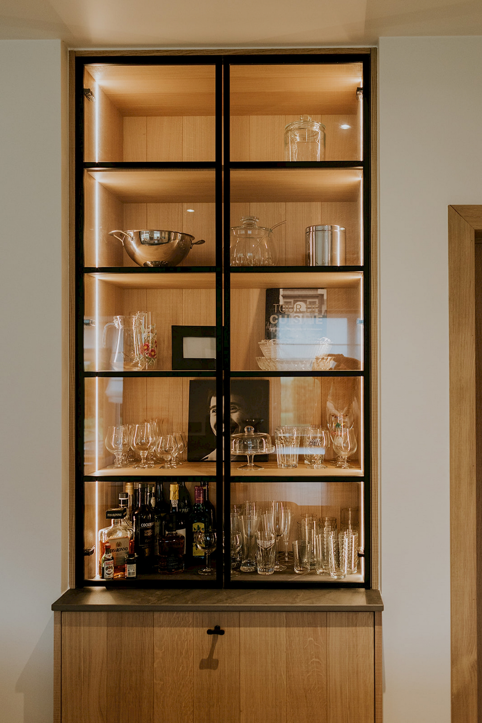 Deze keuken ademt een strakke landelijke stijl uit, waarbij de fronten in half massief eikenhout een warme uitstraling toevoegen. De verticale groeven in het eikenhout benadrukken enerzijds het landelijke karakter van de keuken, en anderzijds geven deze strakke lijnen een eigentijdse touch. De glaskast met steellook deuren biedt een elegante manier om serviesgoed, glaswerk of decoratieve items tentoon te stellen. Dat maakt dat de strakke opstelling toch een persoonlijk en uitnodigend karakter krijgt. De glasdeuren dragen bij aan een landelijke sfeer en voegen tevens een vleugje industriële stijl toe.