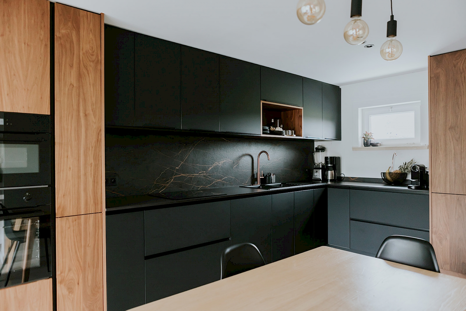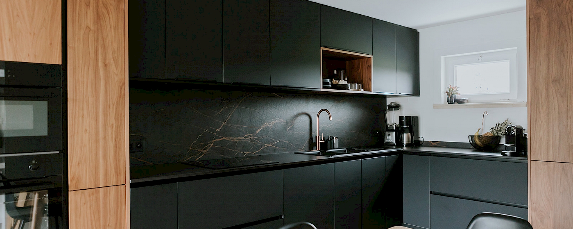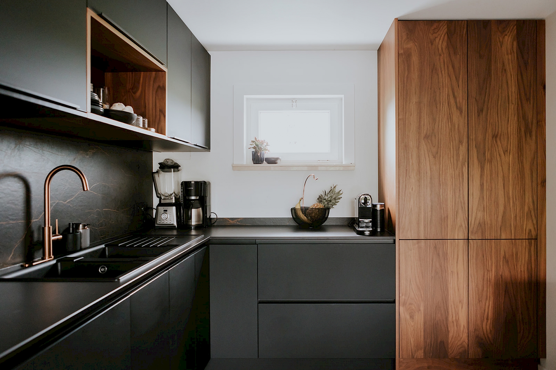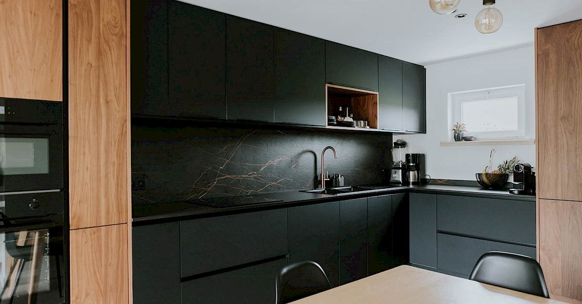 De fronten in notelaar fineer voegen natuurlijke schoonheid toe bij deze matzwarte keuken, wat resulteert in een harmonieuze balans. De toevoeging van koperkleurige accenten brengt een vleugje luxe en warmte in de ruimte. Koper vormt een prachtige aanvulling op het matzwarte en notelaar fineer, waardoor de keuken een verfijnde en eigentijdse uitstraling krijgt. Zo bijvoorbeeld met de koperkleurige Selzius kokendwaterkraan die hier voorzien is. Deze kraan zorgt voor snel en eenvoudig kokend water voor verschillende culinaire toepasseningen. Het werkblad in Dekton Domoos is niet alleen hittebestendig, maar ook duurzaam en gemakkelijk te onderhouden. Dit maakt het ideaal voor een keukenomgeving, waar het dagelijkse koken en bereiden van voedsel plaatsvindt. De keuze voor wandbekleding in Dekton Laurent geeft de keuken een luxueuze toets. Verder is in deze keuken ook een uittrekbare apotheekkast voorzien die praktisch en functioneel is voor het opbergen van voorraad. Deze slimme kast zorgt voor een overzichtelijke en georganiseerde opslag van voedingsmiddelen, waardoor de keuken efficiënter wordt gebruikt. In het geheel genomen resulteert deze keukencombinatie in een harmonieuze mix van functionaliteit, esthetiek en moderne luxe.
