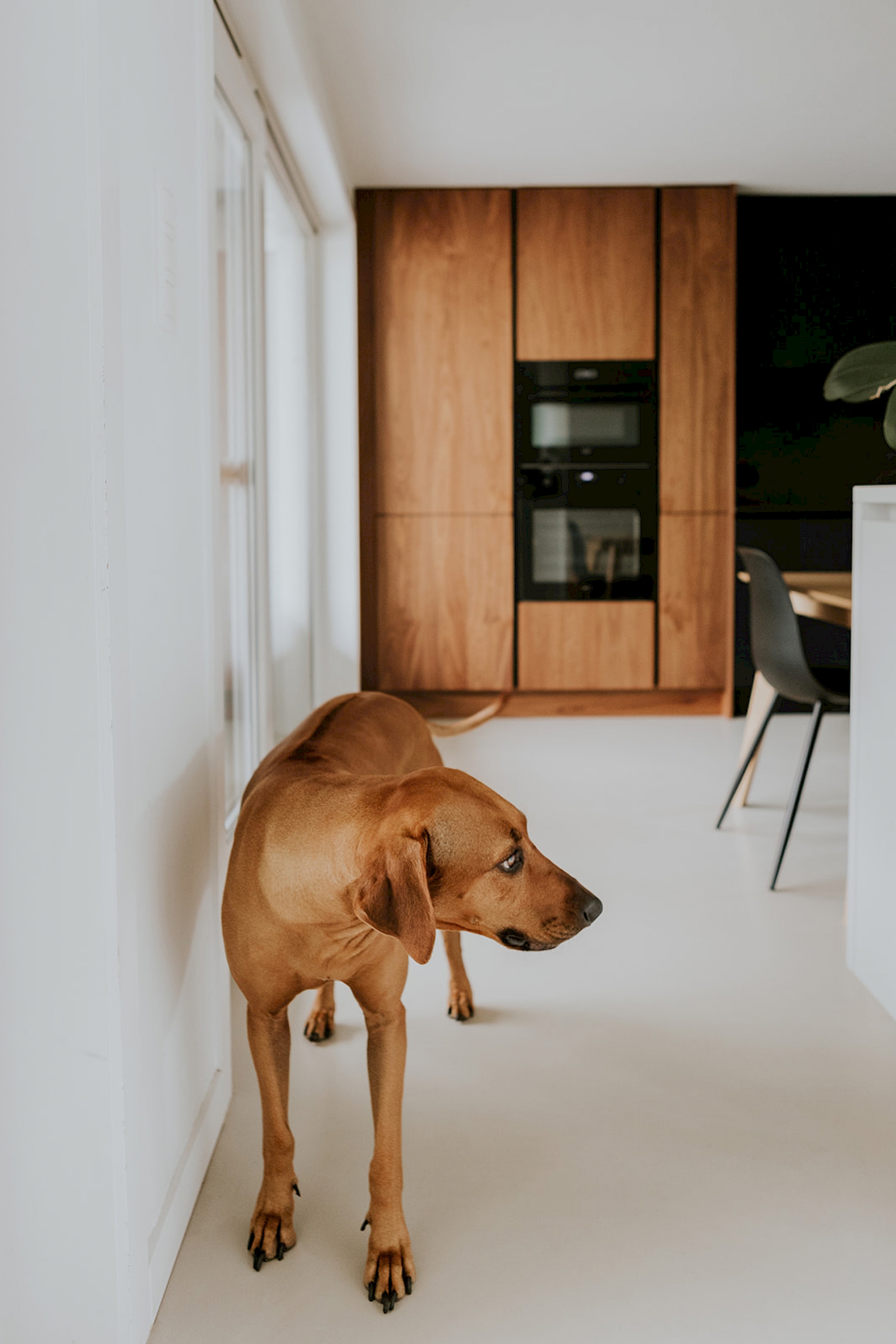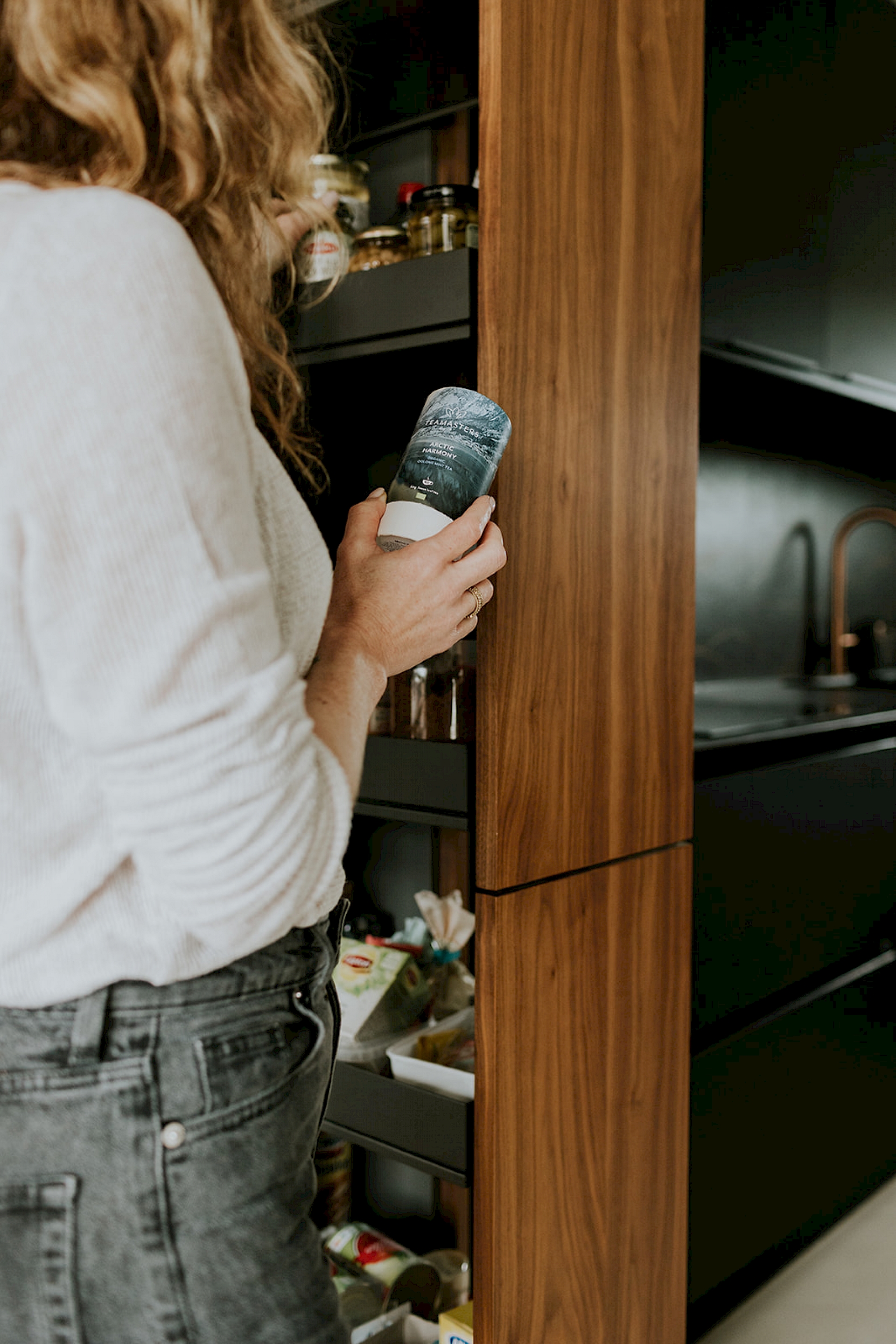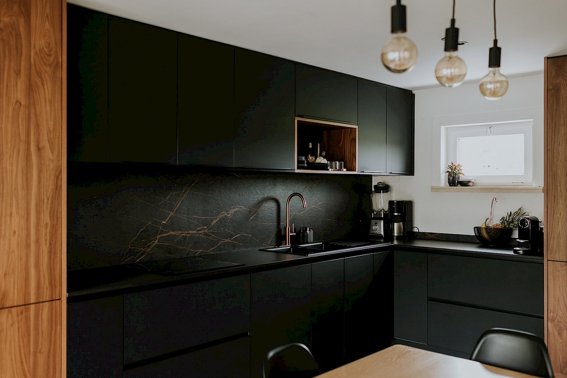 De fronten in notelaar fineer voegen natuurlijke schoonheid toe bij deze matzwarte keuken, wat resulteert in een harmonieuze balans. De toevoeging van koperkleurige accenten brengt een vleugje luxe en warmte in de ruimte. Koper vormt een prachtige aanvulling op het matzwarte en notelaar fineer, waardoor de keuken een verfijnde en eigentijdse uitstraling krijgt. Zo bijvoorbeeld met de koperkleurige Selzius kokendwaterkraan die hier voorzien is. Deze kraan zorgt voor snel en eenvoudig kokend water voor verschillende culinaire toepasseningen. Het werkblad in Dekton Domoos is niet alleen hittebestendig, maar ook duurzaam en gemakkelijk te onderhouden. Dit maakt het ideaal voor een keukenomgeving, waar het dagelijkse koken en bereiden van voedsel plaatsvindt. De keuze voor wandbekleding in Dekton Laurent geeft de keuken een luxueuze toets. Verder is in deze keuken ook een uittrekbare apotheekkast voorzien die praktisch en functioneel is voor het opbergen van voorraad. Deze slimme kast zorgt voor een overzichtelijke en georganiseerde opslag van voedingsmiddelen, waardoor de keuken efficiënter wordt gebruikt. In het geheel genomen resulteert deze keukencombinatie in een harmonieuze mix van functionaliteit, esthetiek en moderne luxe.