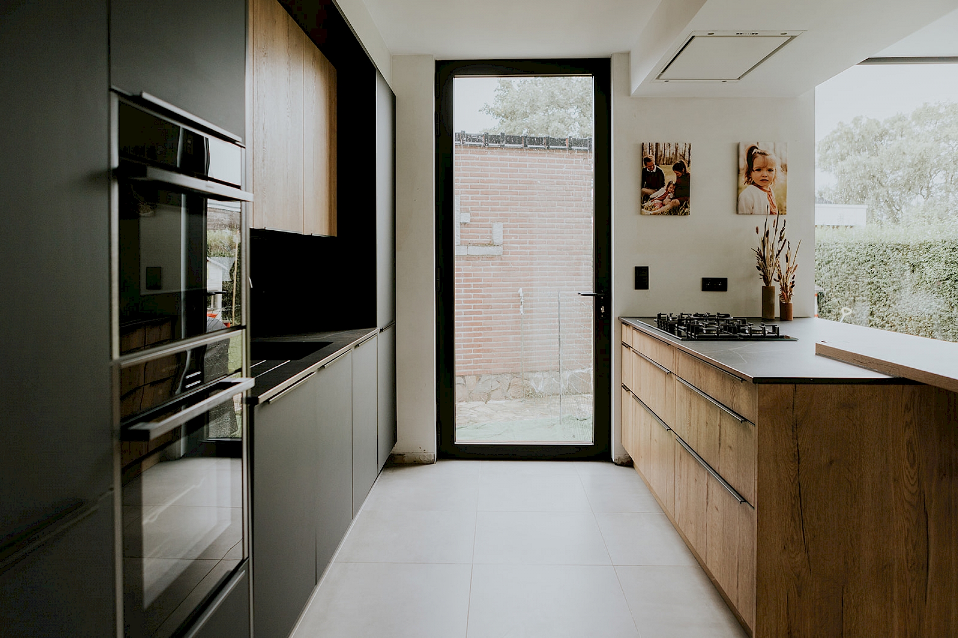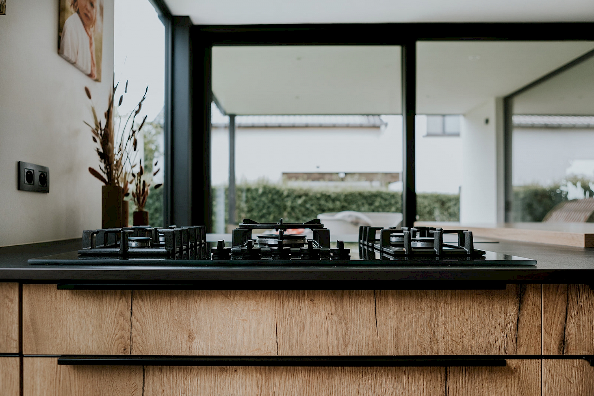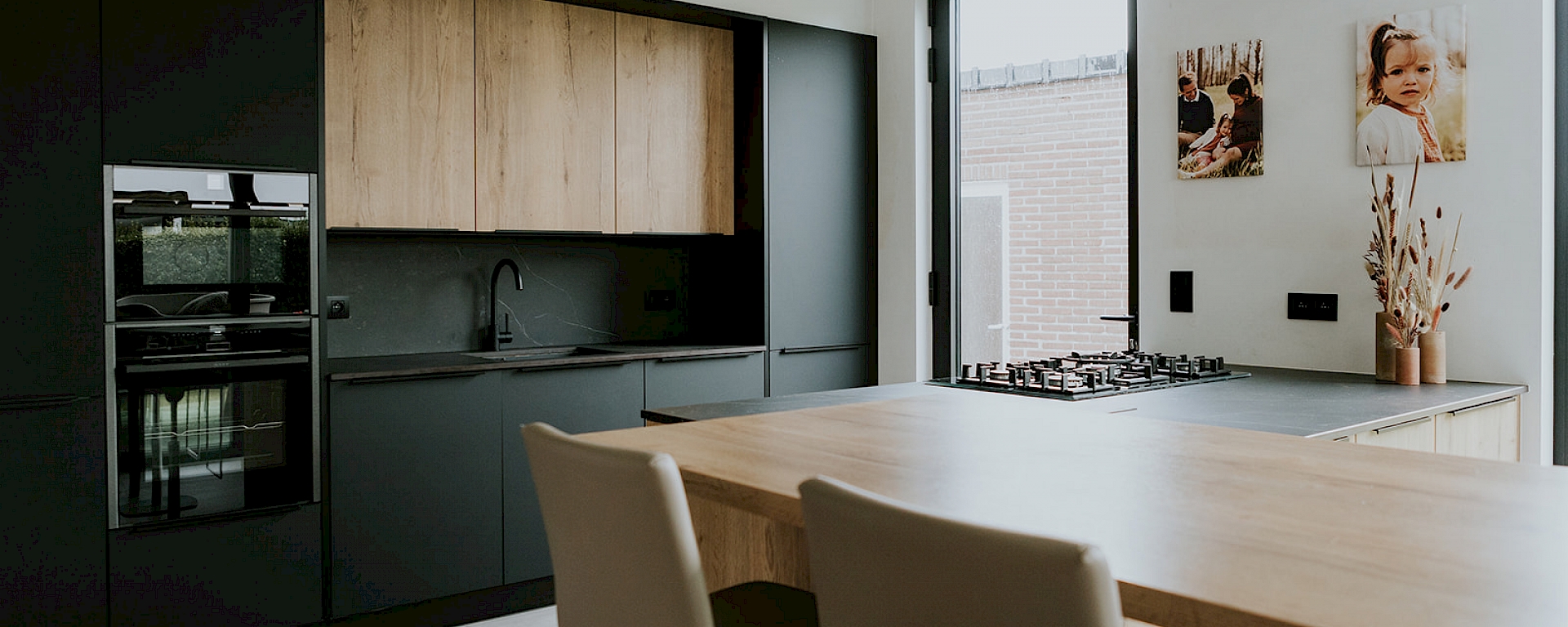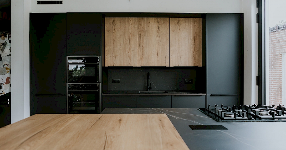 Wil je extra warmte creëren in een zwarte keuken dan is een natuurlijke houtkleur een uitstekende keuze. Door de muren in een lichte kleur te verven, werd er ook contrast gecreëerd en voelt de ruimte lichter aan. Zwart is een veelzijdige kleur en kan aangepast worden aan iedere stijl en smaak. Deze matzwarte fronten hebben een anti-fingerprint coating gekregen. Het matzwarte oppervlak weerkaatst geen licht, waardoor de ruimte ook nog rustiger oogt. Voor het werkblad werd hittebestendig Dekton Kelya gekozen, niet alleen mooi maar vooral ook praktisch.