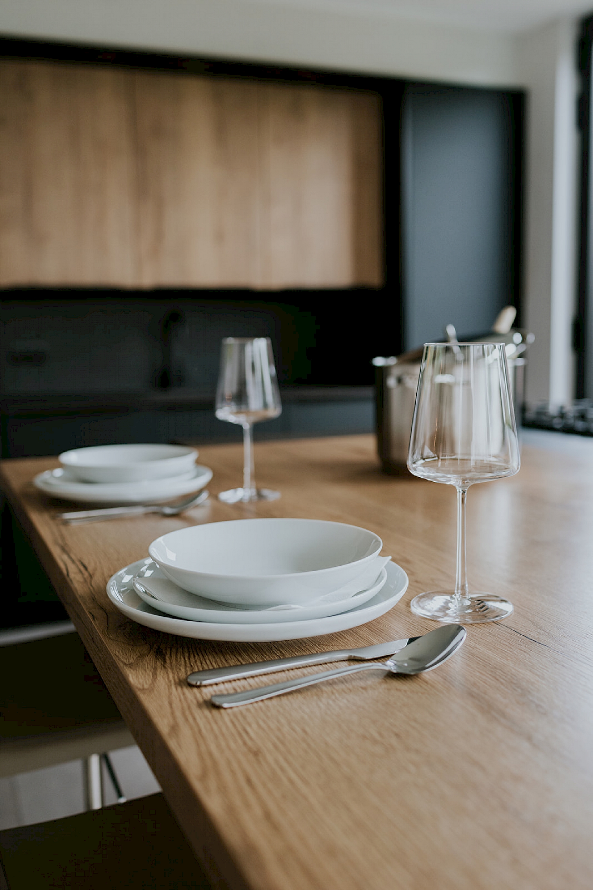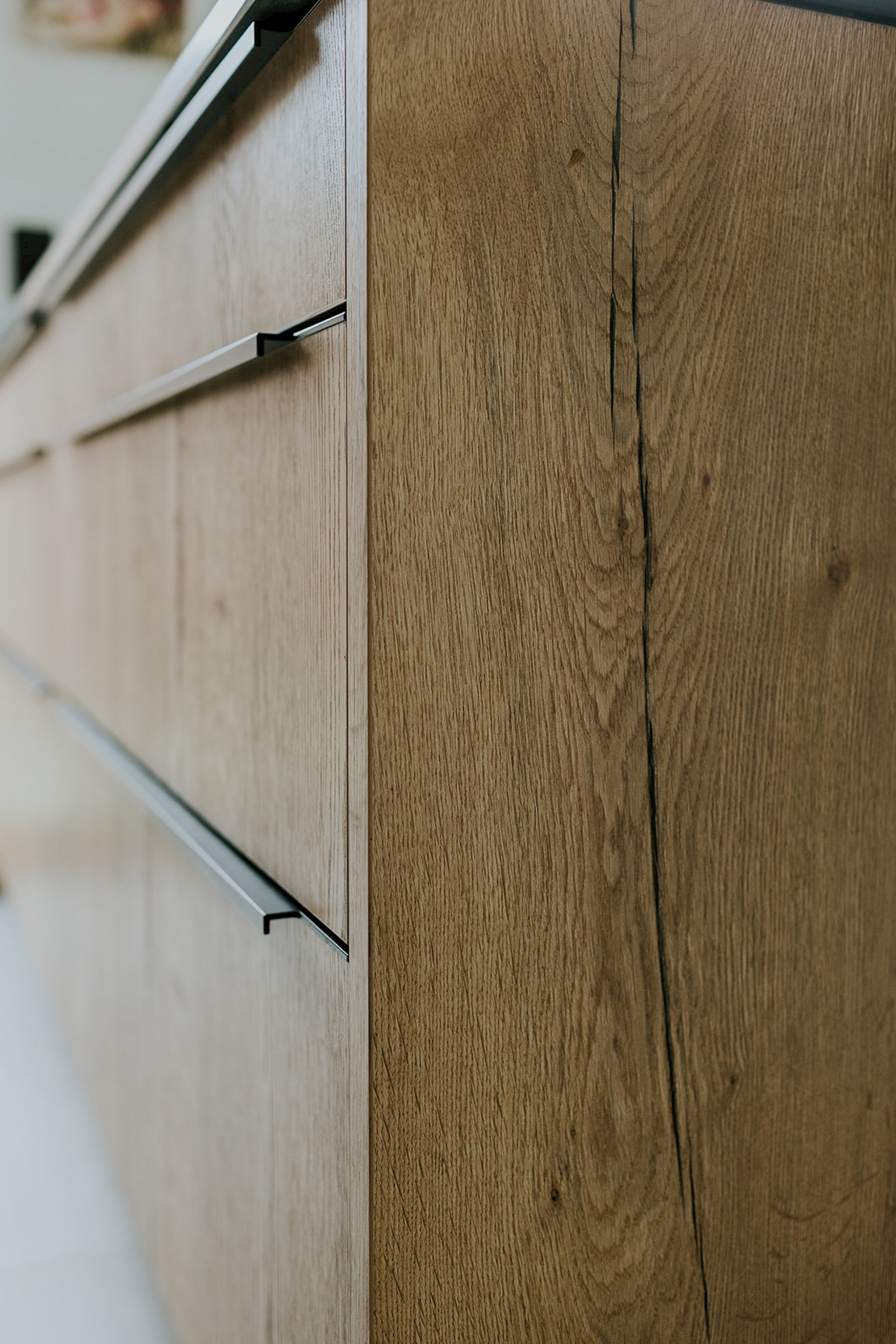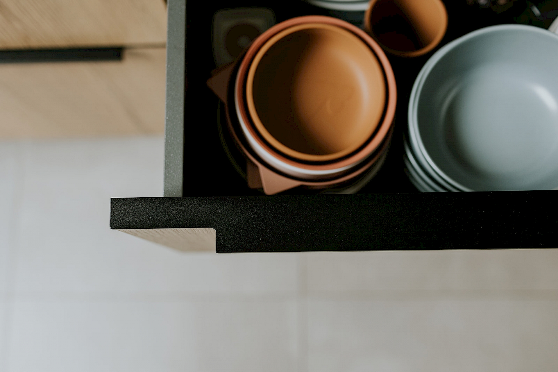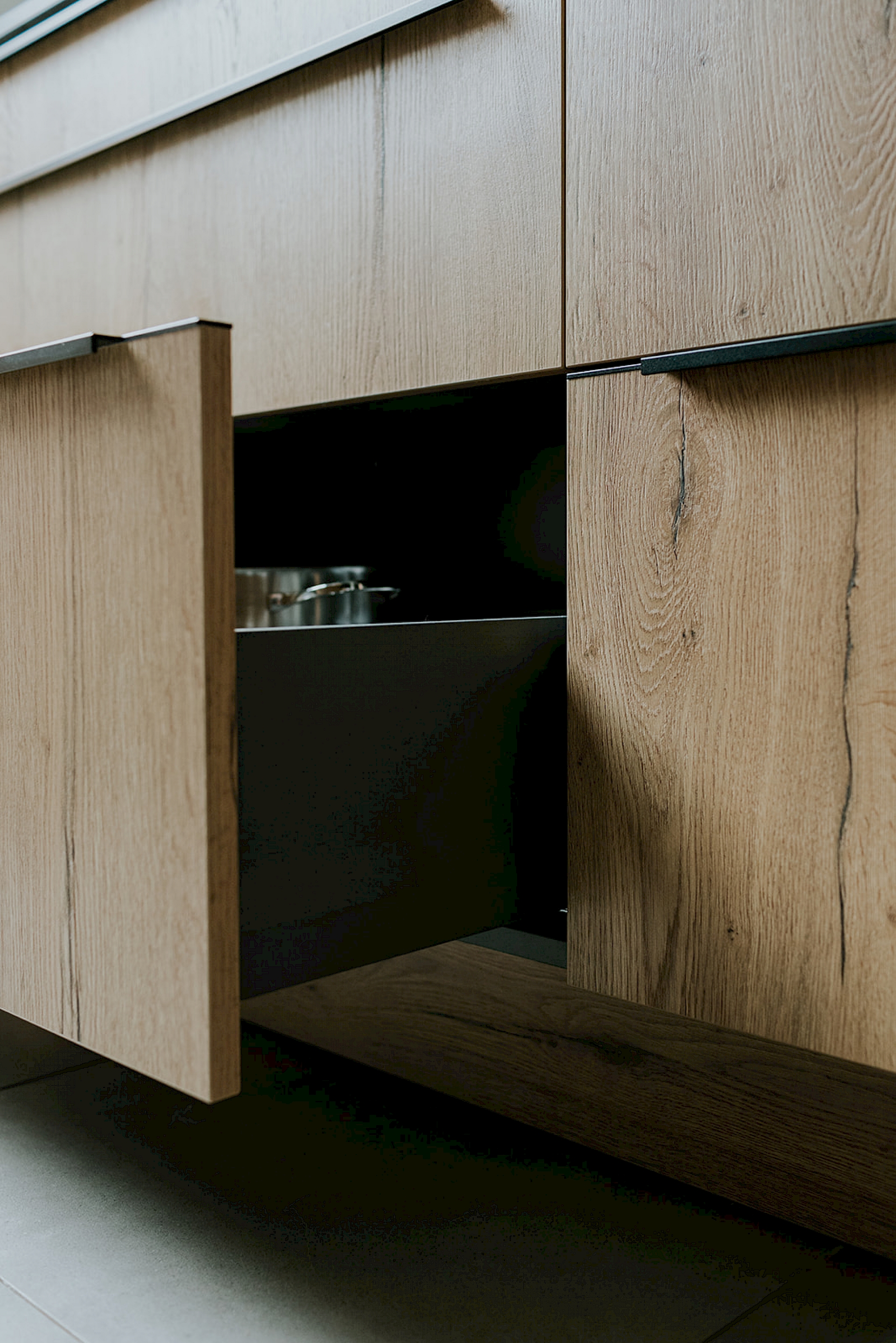 Wil je extra warmte creëren in een zwarte keuken dan is een natuurlijke houtkleur een uitstekende keuze. Door de muren in een lichte kleur te verven, werd er ook contrast gecreëerd en voelt de ruimte lichter aan. Zwart is een veelzijdige kleur en kan aangepast worden aan iedere stijl en smaak. Deze matzwarte fronten hebben een anti-fingerprint coating gekregen. Het matzwarte oppervlak weerkaatst geen licht, waardoor de ruimte ook nog rustiger oogt. Voor het werkblad werd hittebestendig Dekton Kelya gekozen, niet alleen mooi maar vooral ook praktisch.