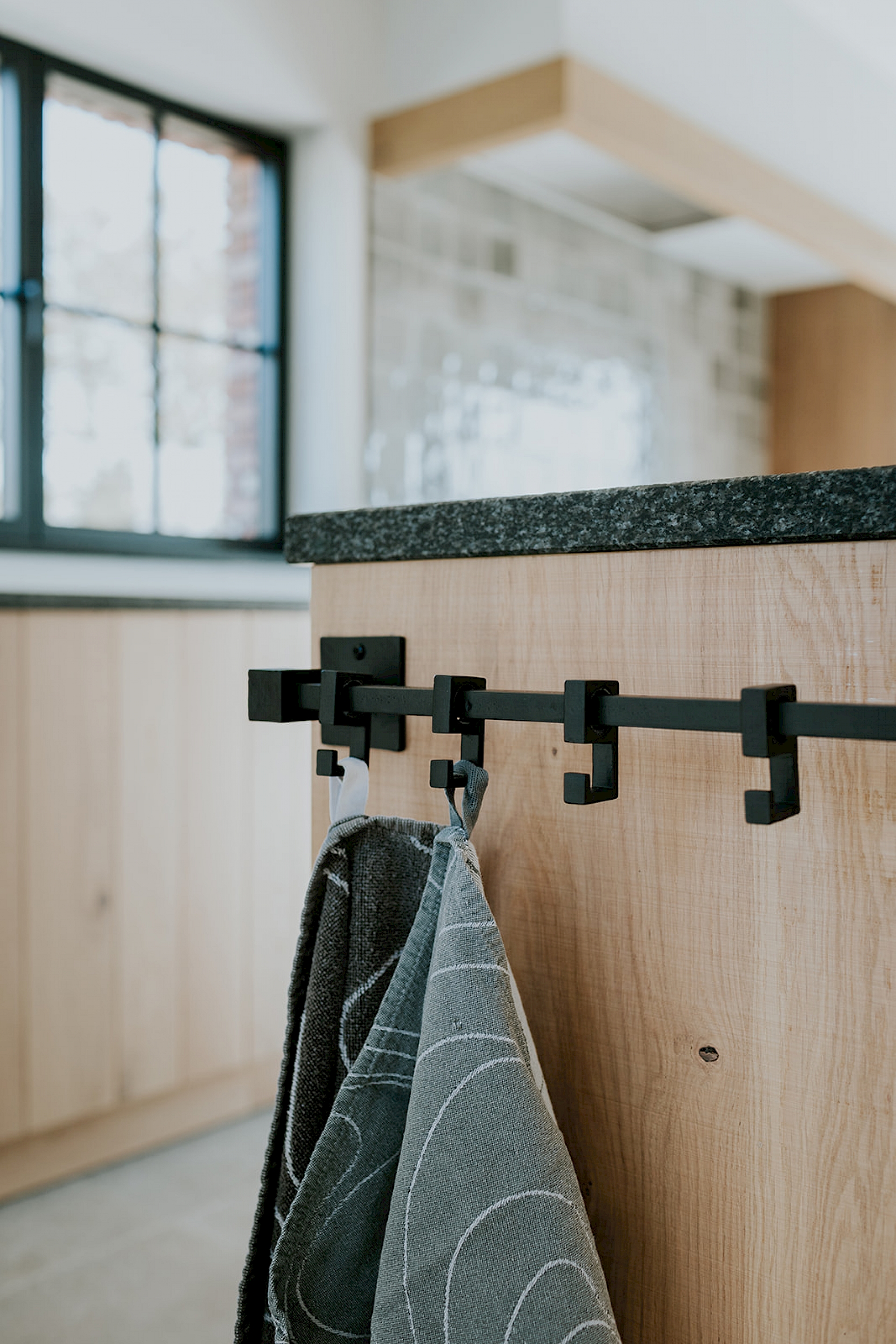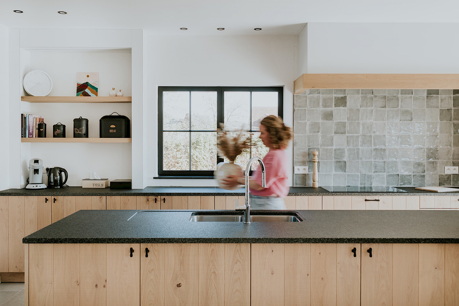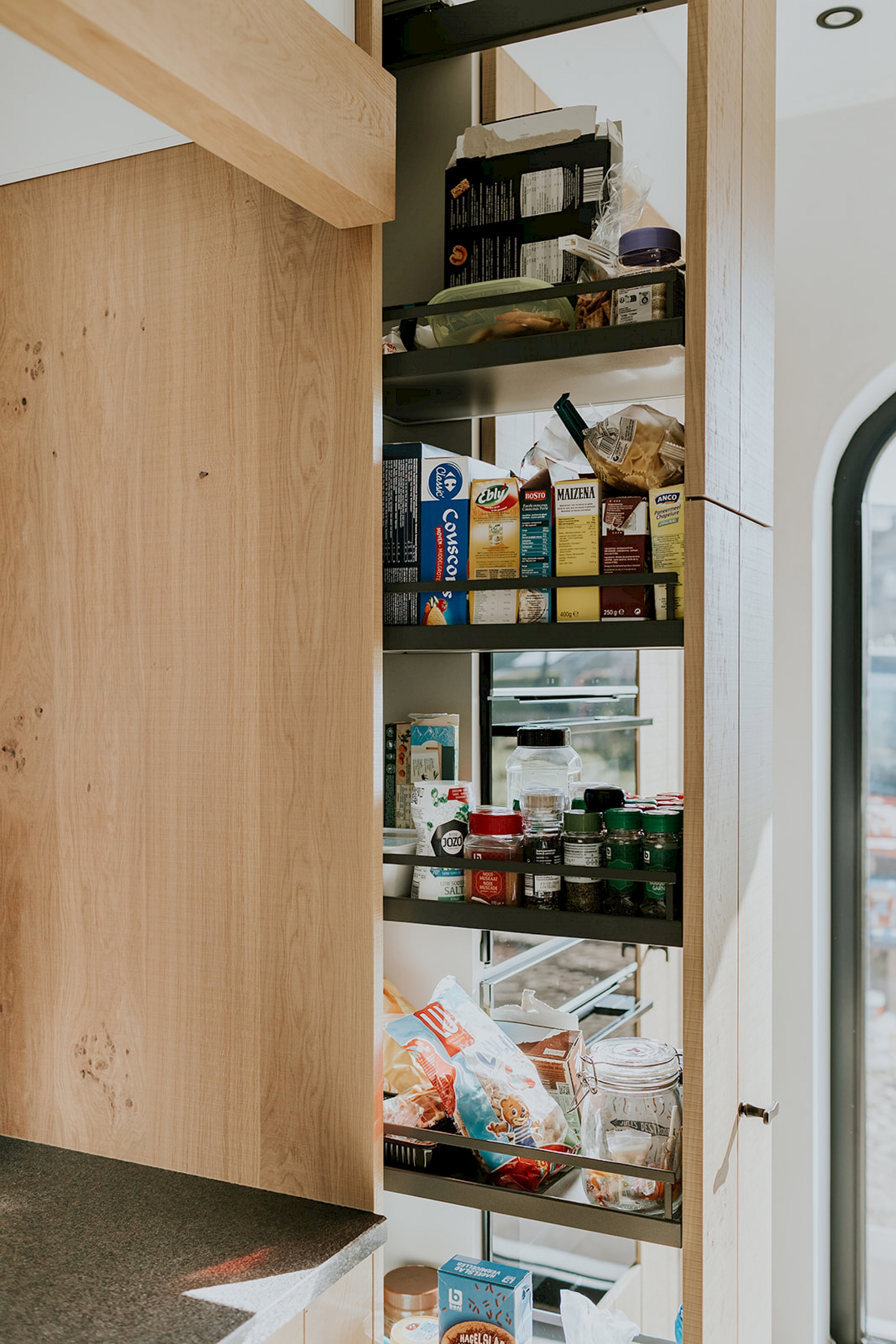 De fronten zijn uitgevoerd in model Semio, half massief eik met wisselende U-groeven. Het gekozen rustieke eikenhout toont zijn natuurlijke charme met karaktervolle noesten, terwijl de scratch- en zaagruwe bewerking zorgt voor een stoere, authentieke toets. Het robuuste granieten werkblad in Bedrock Black met riverwashed oppervlak vult dit prachtig aan en straalt pure degelijkheid uit. De zwarte greepjes in verouderd ijzer geven de keuken een landelijke elegantie, aangevuld met een bijpassende handdoekenstang in hetzelfde materiaal. Achter de charme schuilt ook slimme functionaliteit: een volledig uittrekbare apotheekkast zorgt voor een overzichtelijke en praktische opslag van de keukenvoorraad. Daarnaast is er een apart koffiehoekje ingericht, een gezellige plek op het werkblad waar ruimte is om persoonlijke spullen te etaleren.