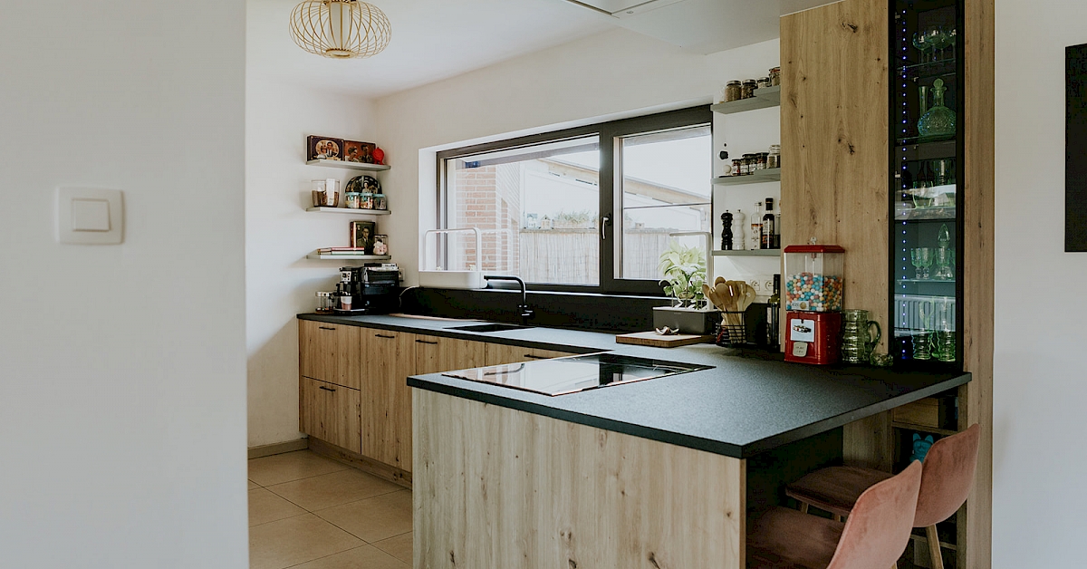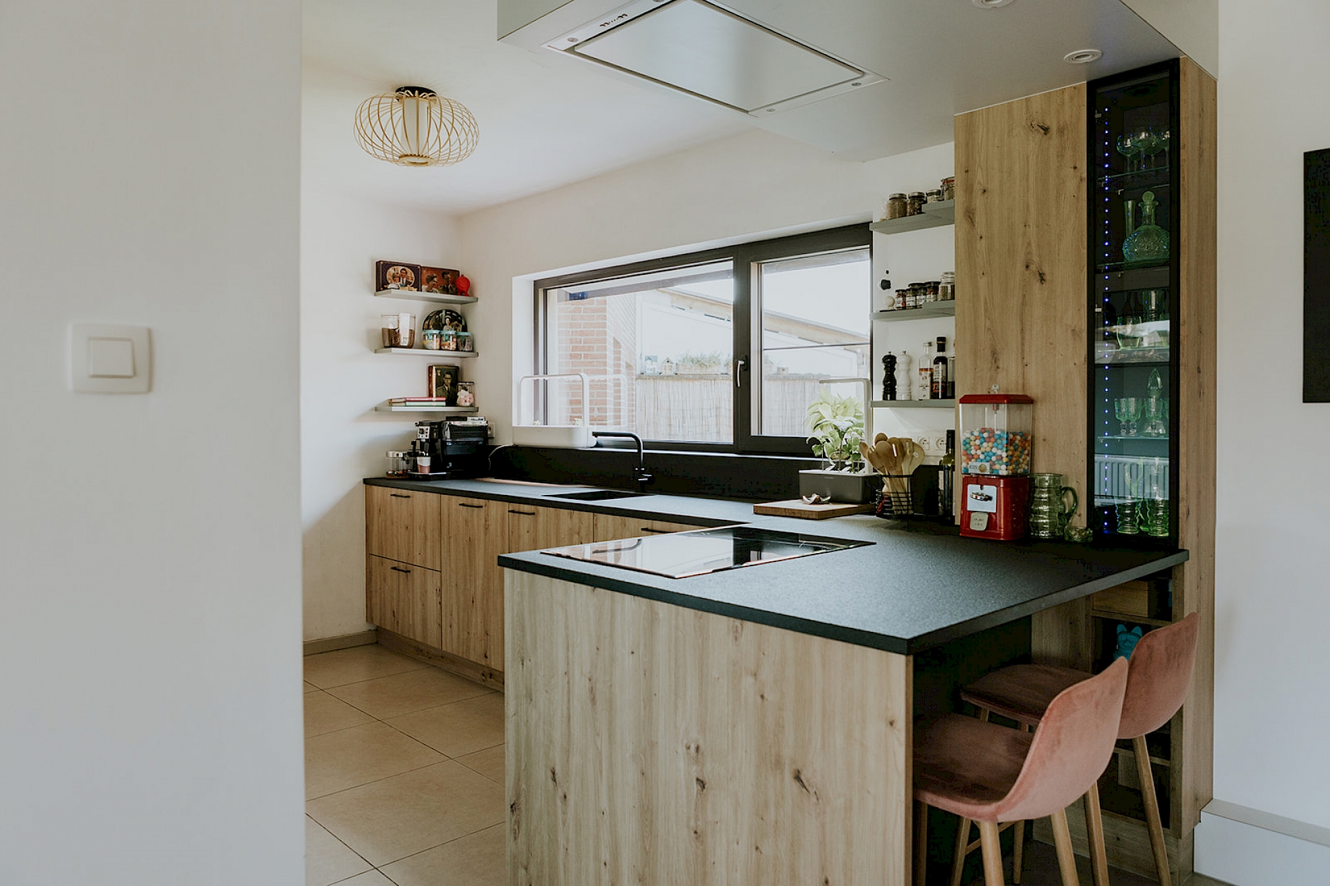 Een keuken is veel meer dan een plek om te koken. Het is een ruimte waar je samenkomt, herinneringen maakt en waar jouw persoonlijkheid zichtbaar mag zijn. Dit ontwerp bewijst hoe materialen en accenten samen een sfeervolle en unieke plek vormen. De basis bestaat uit BALI zomereik fronten met een granieten werkblad in Black I riverwashed. De warme houtlook en het karaktervolle graniet – ook doorgetrokken in de vensterbank – zorgen voor een tijdloze, gezellige uitstraling.