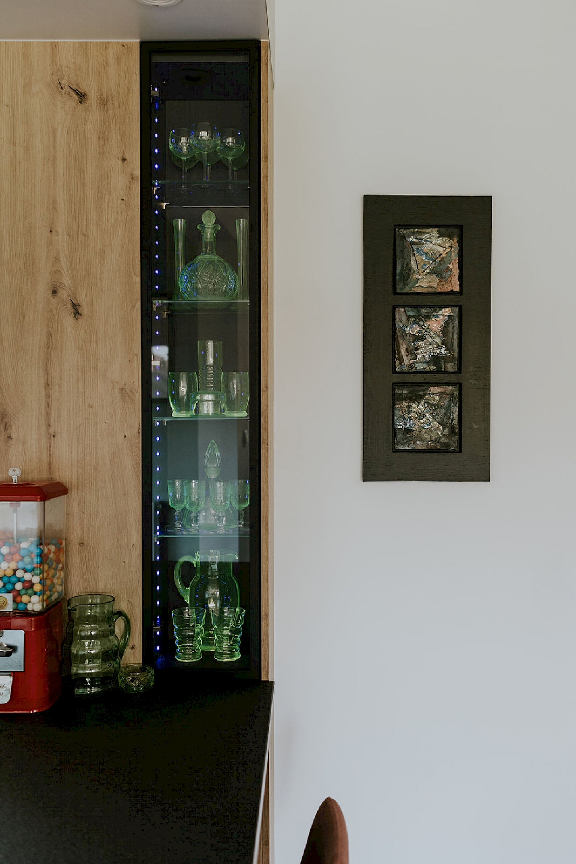 Wat deze keuken echt bijzonder maakt, zijn de persoonlijke details. Een op maat gemaakte vitrinekast laat de bijzondere uraniumglascollectie van de bewoners schitteren, dankzij een subtiele UV-ledstrip. Eucalyptusgroene wandregalen brengen extra speelsheid en geven ruimte aan persoonlijke snuisterijen.