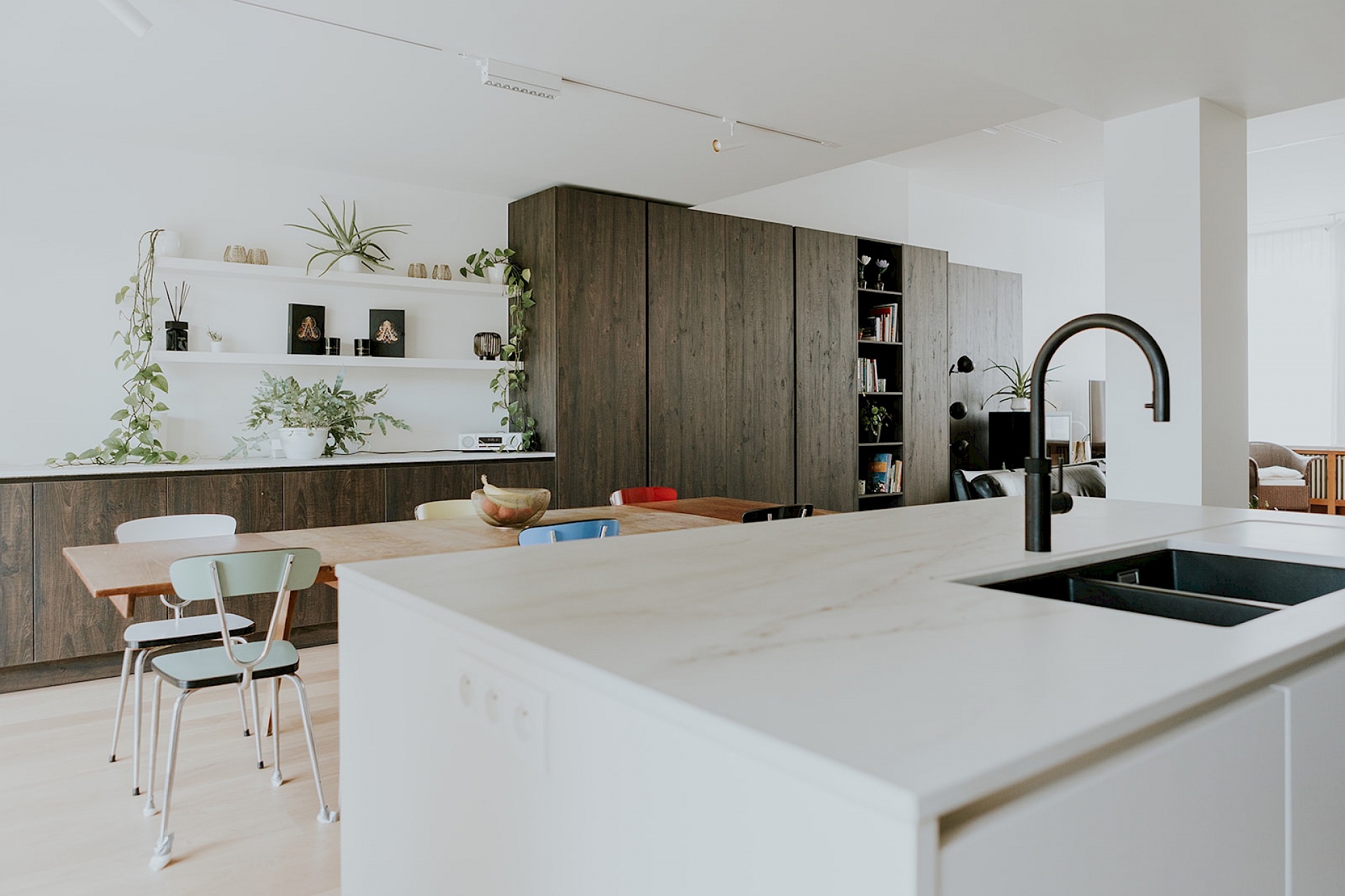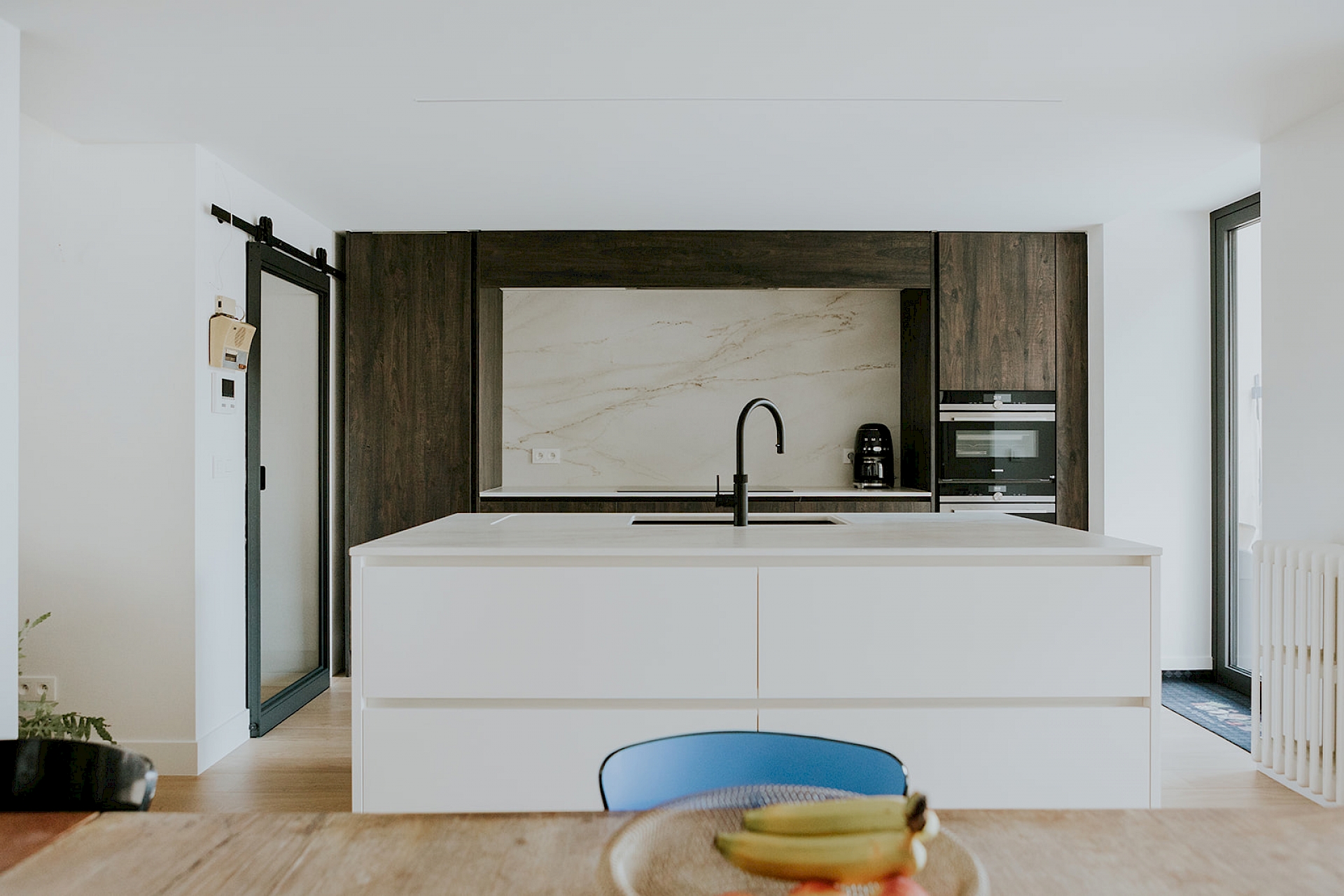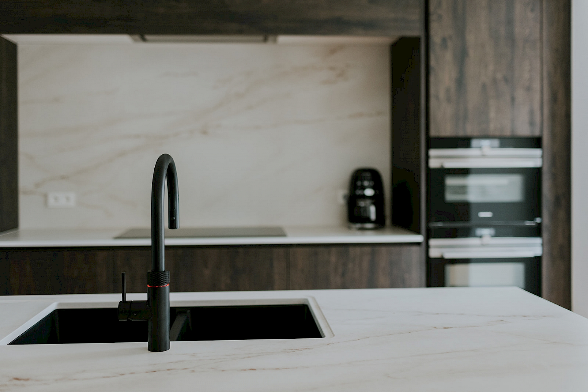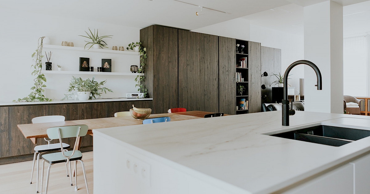 In deze woning werden keuken en leefruimte tot een passend geheel gecombineerd. De strakke vormgeving werd in een warm jasje gestopt met de donkerbruine houtlook. Dit donkerbruin straalt een gevoel van rust en gezelligheid uit en geeft een mooi contrast me de lichtere kleuren in deze ruimte. Deze ruime leefkeuken met veel opbergmogelijkheden werd van alle gemakken voorzien. Er werd een licht gemarmerd werkblad voorzien in hittebestendig Dekton materiaal. En als kers op de taart een kokend - én - bruiswaterkraan van merk Quooker. Het is een gezellig samenzijn hier, waar kook-, eet- en ontspanningruimte in elkaar overlopen.