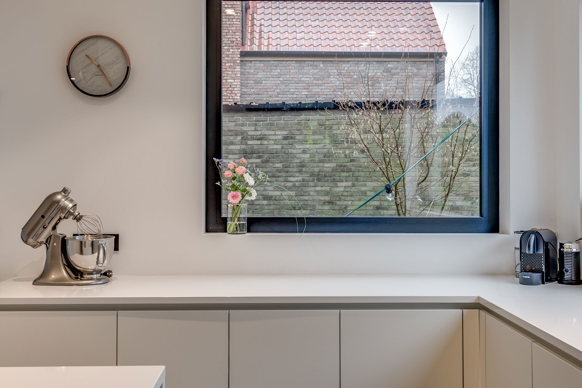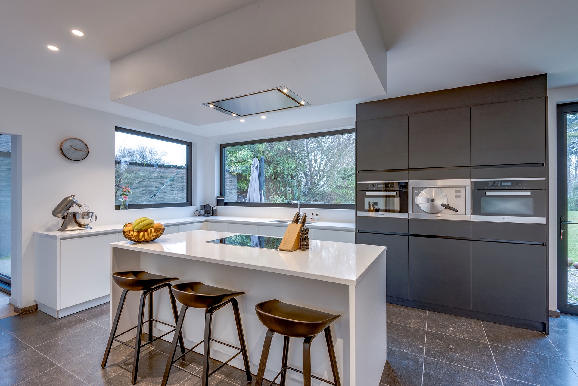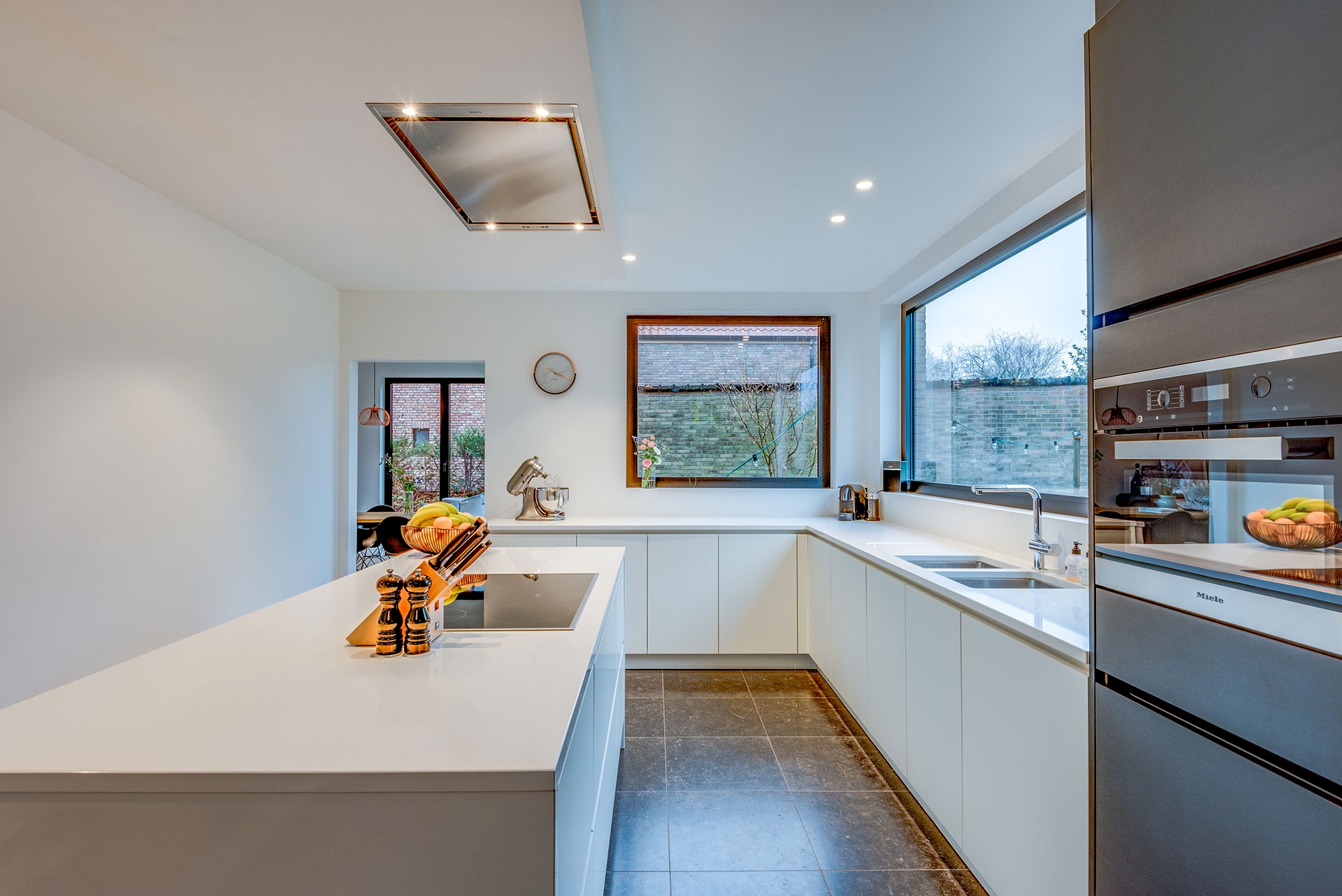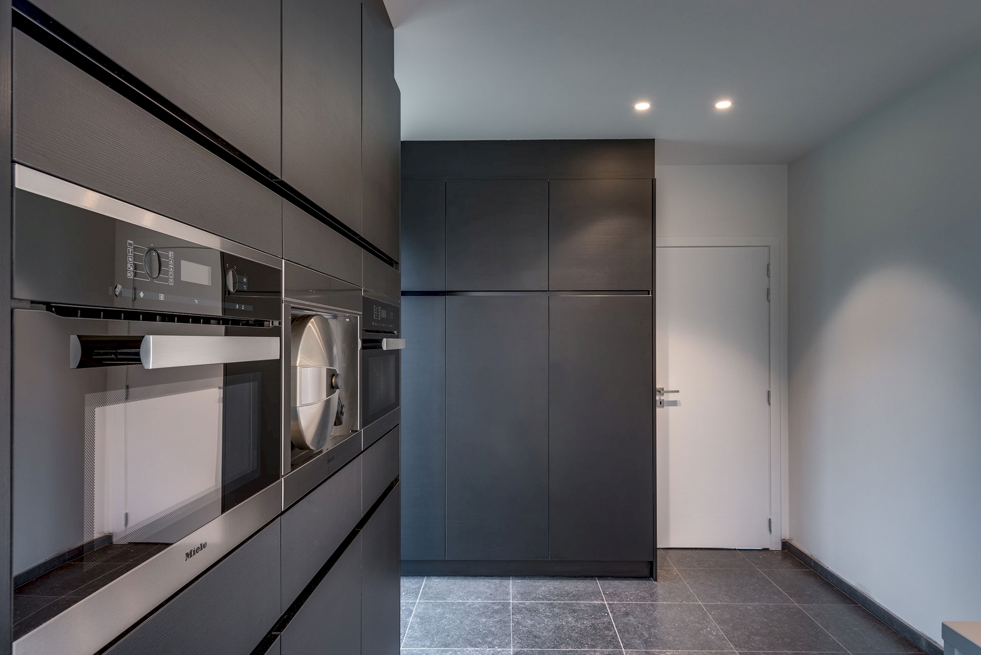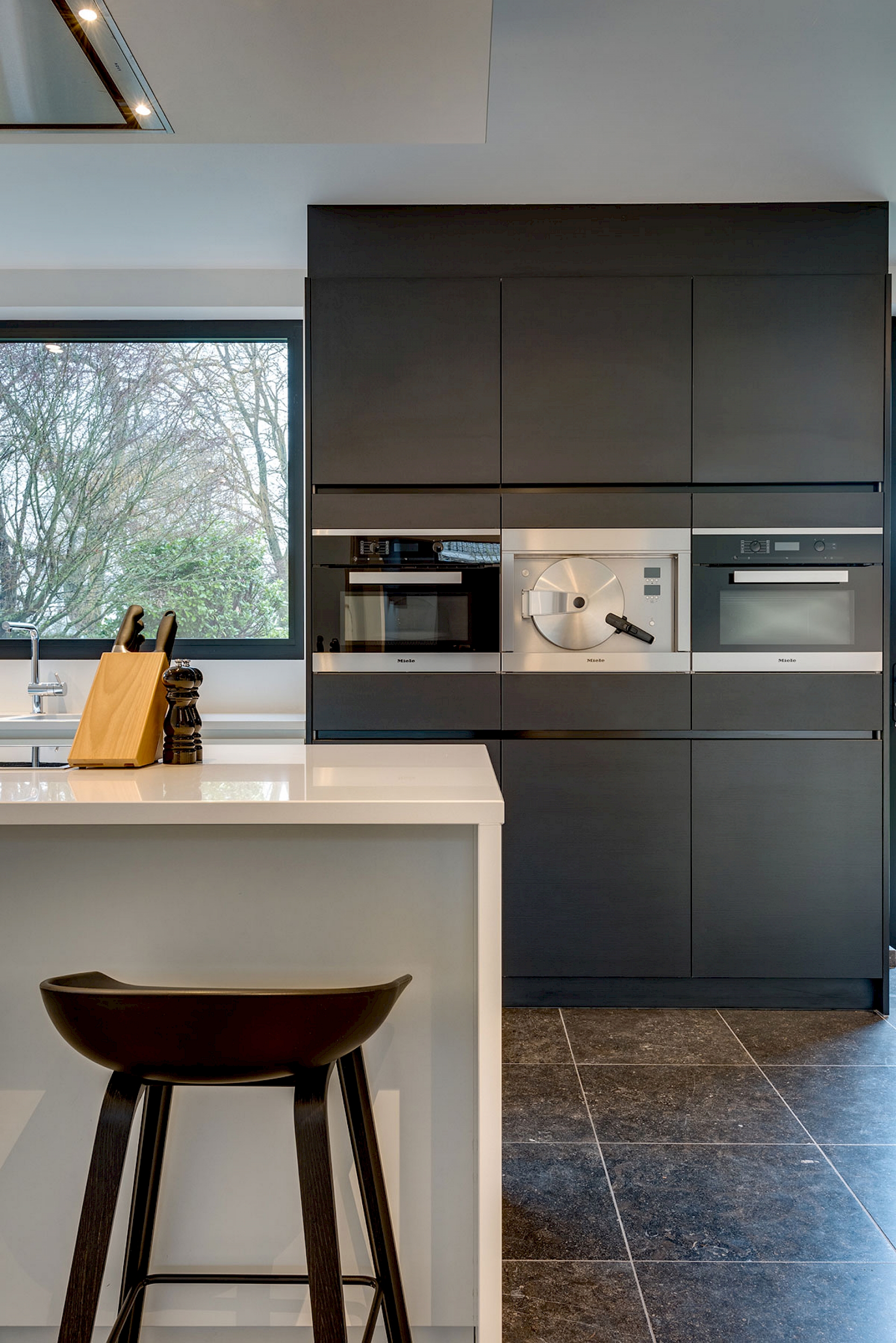 Keuken in witte laminaat en zwarte houtstructuur, voorzien van een werkblad in Silestone-composiet en twee spoelbakken met gefreesde afdruipgroeven. De ingebouwde Miele combi-oven, compacte oven en hogedrukstoomoven werden op dezelfde hoogte geplaatst voor een extra strakke look.
