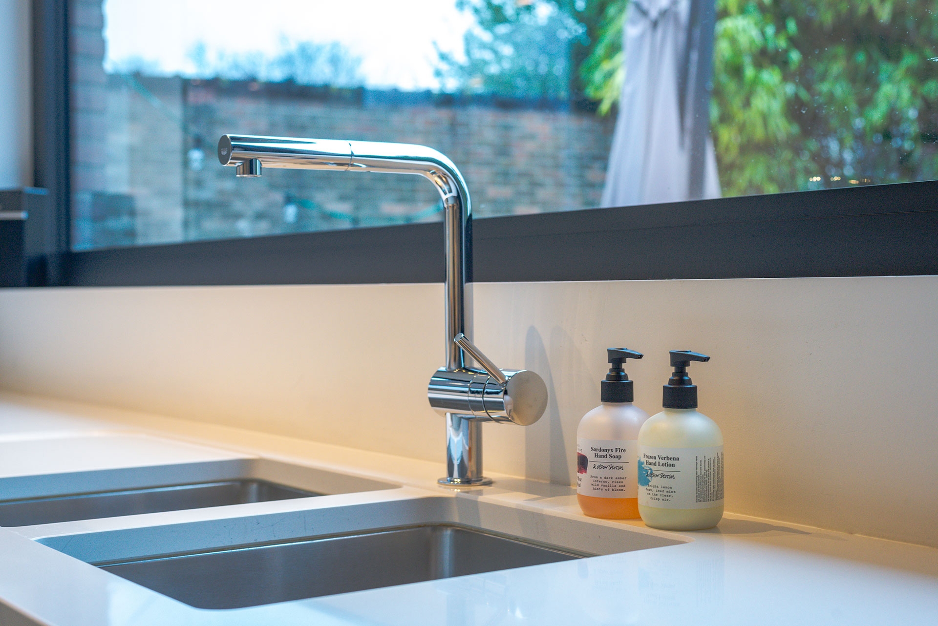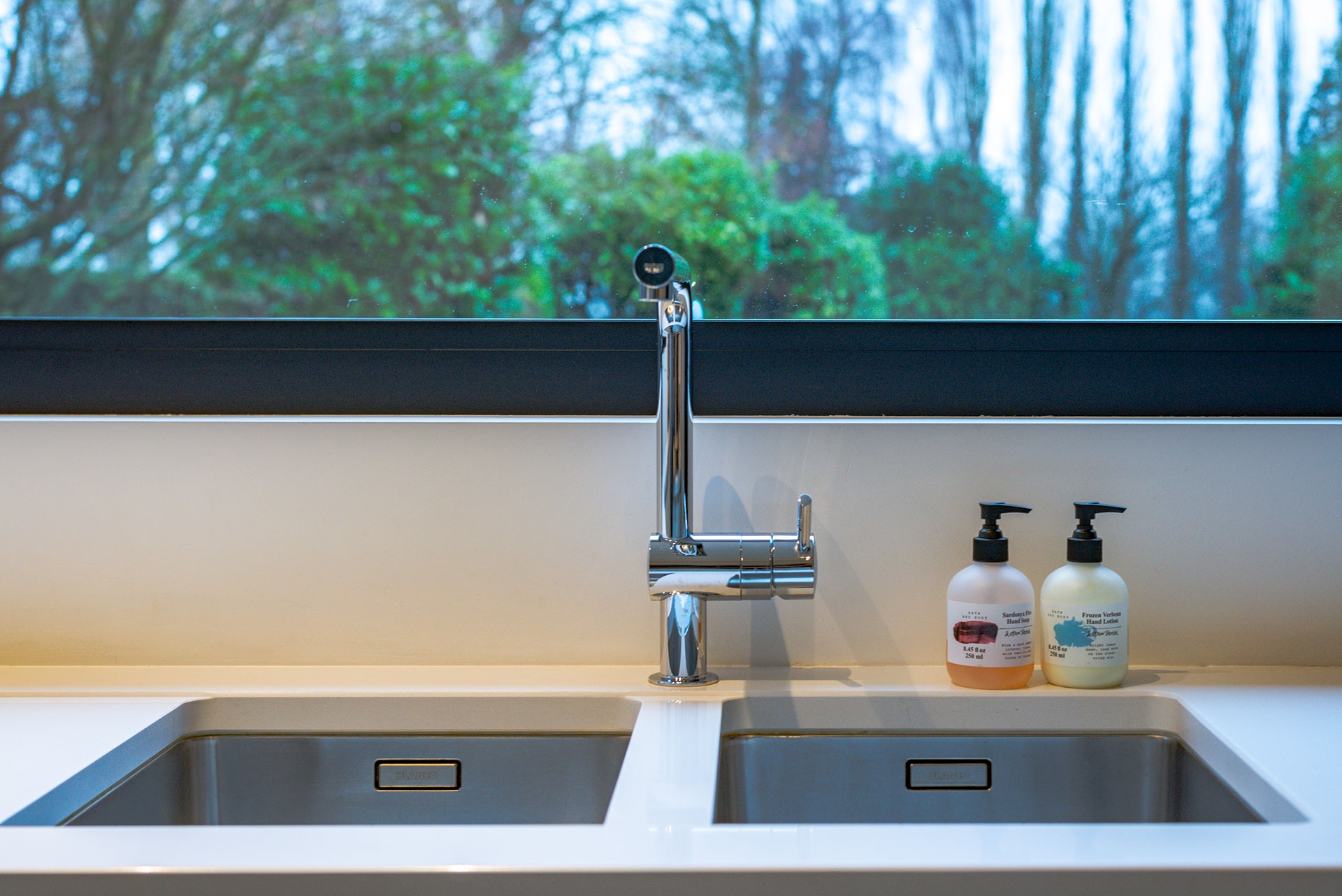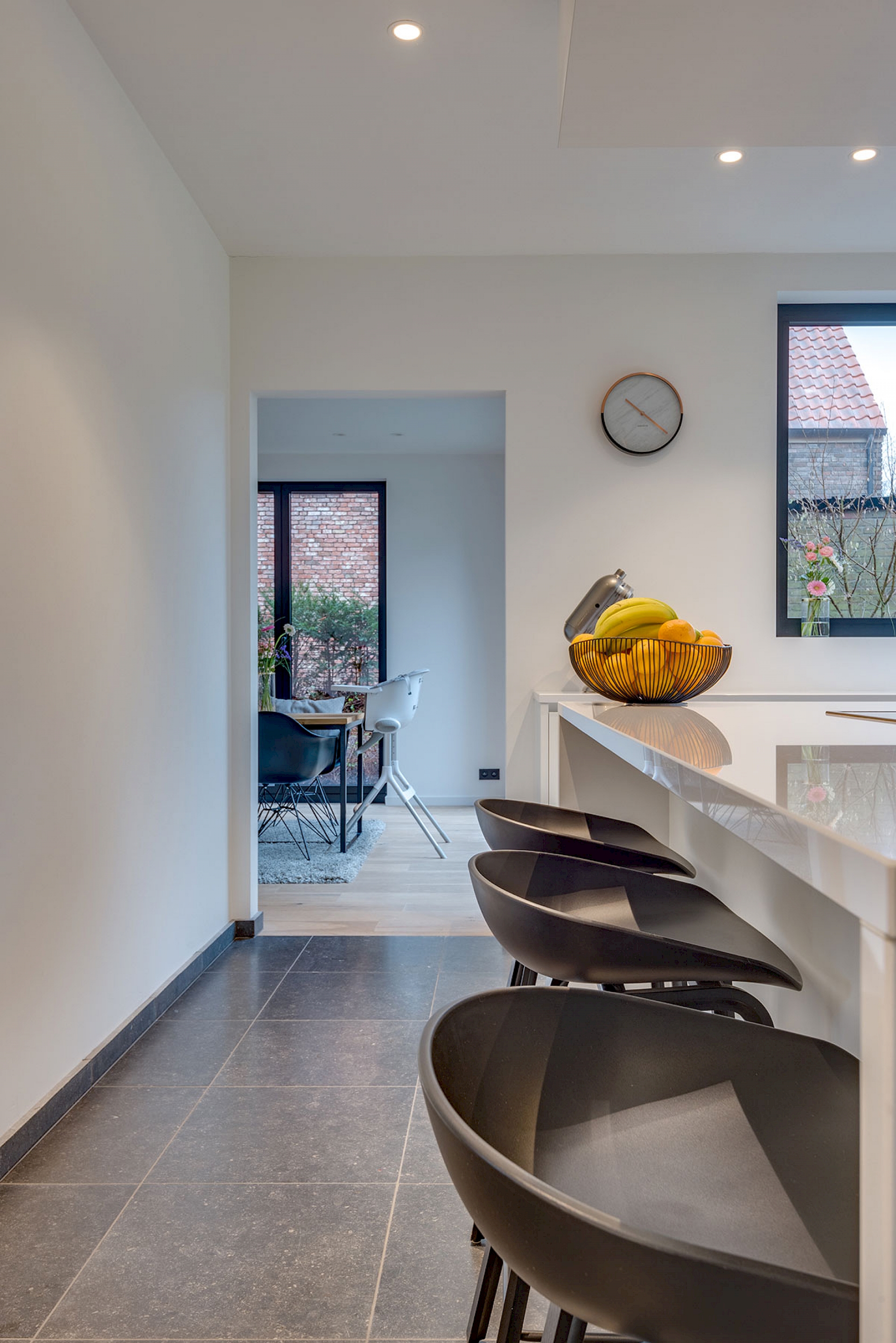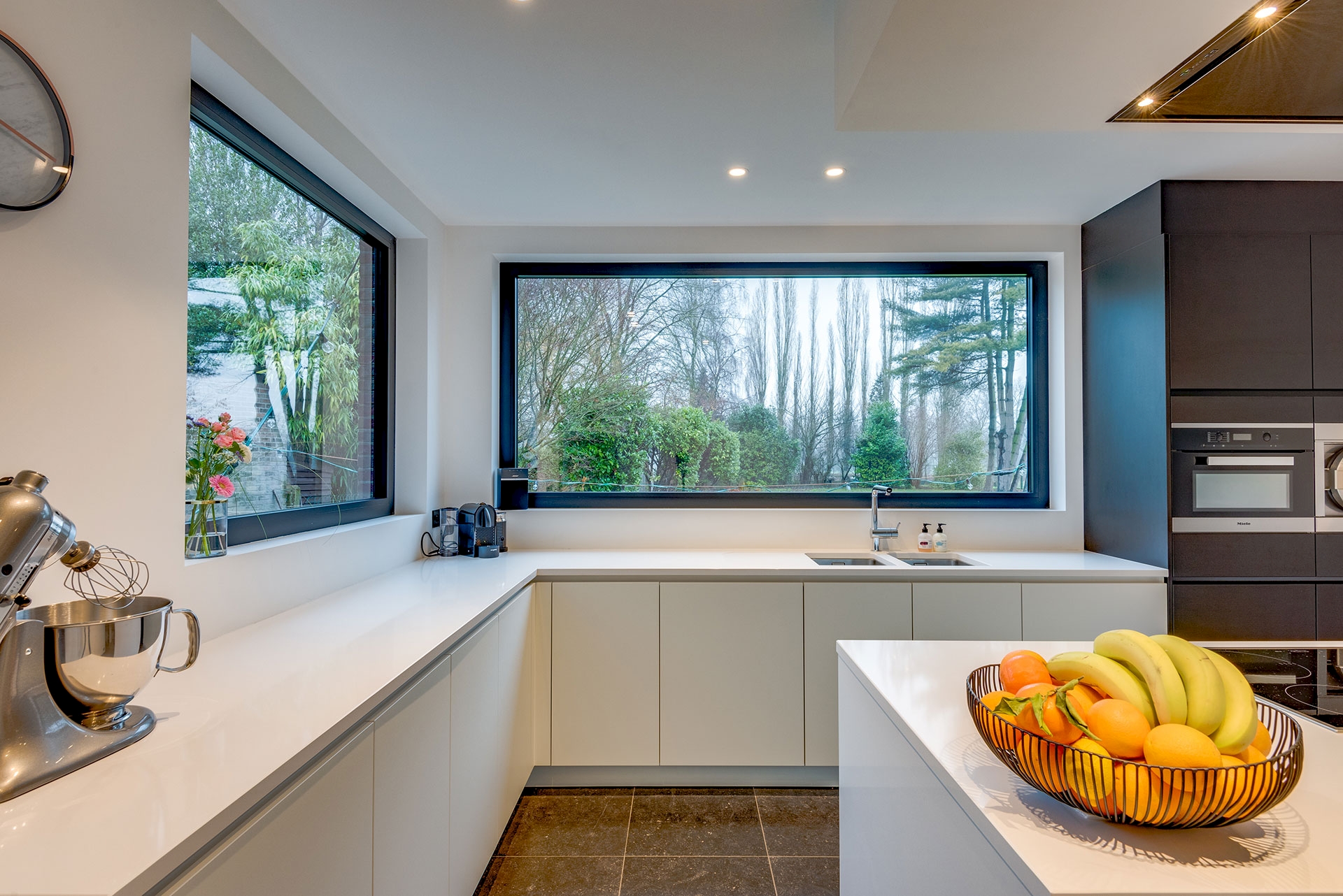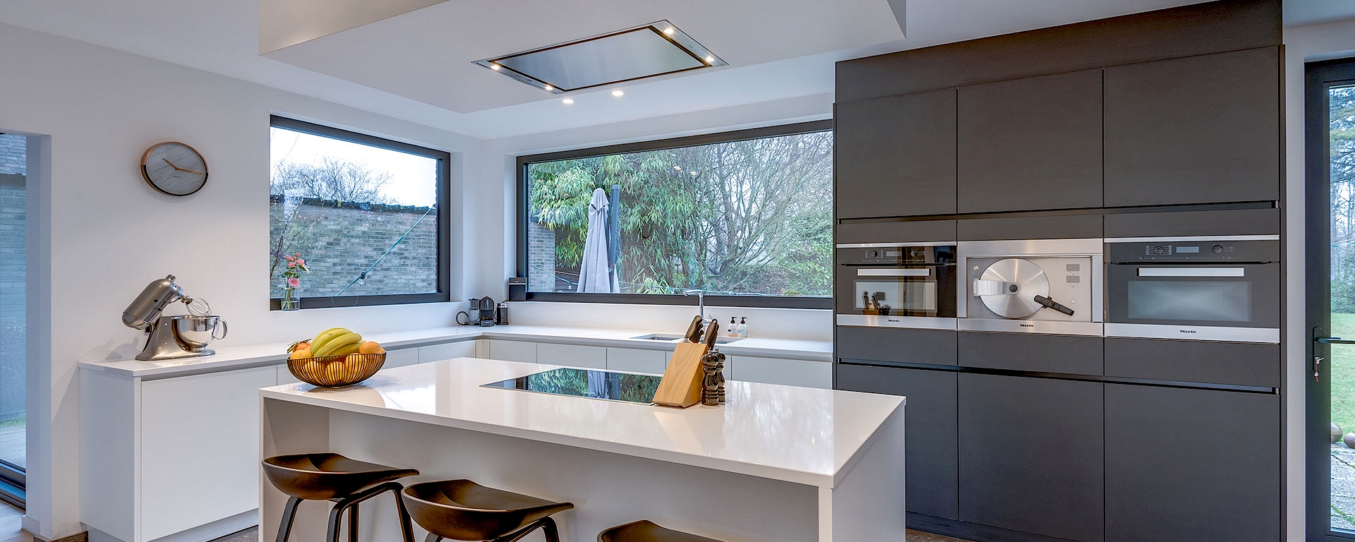Keuken in witte laminaat en zwarte houtstructuur, voorzien van een werkblad in Silestone-composiet en twee spoelbakken met gefreesde afdruipgroeven. De ingebouwde Miele combi-oven, compacte oven en hogedrukstoomoven werden op dezelfde hoogte geplaatst voor een extra strakke look.
